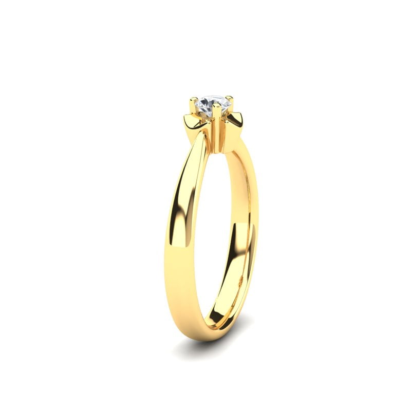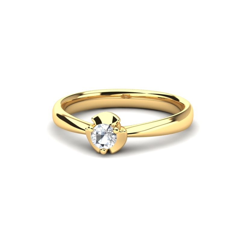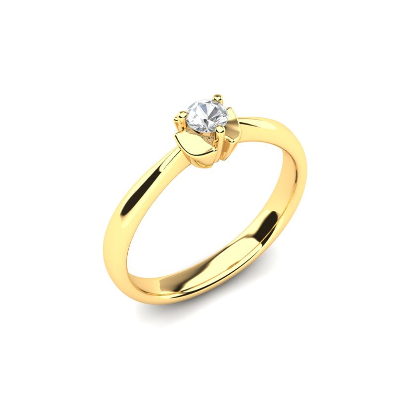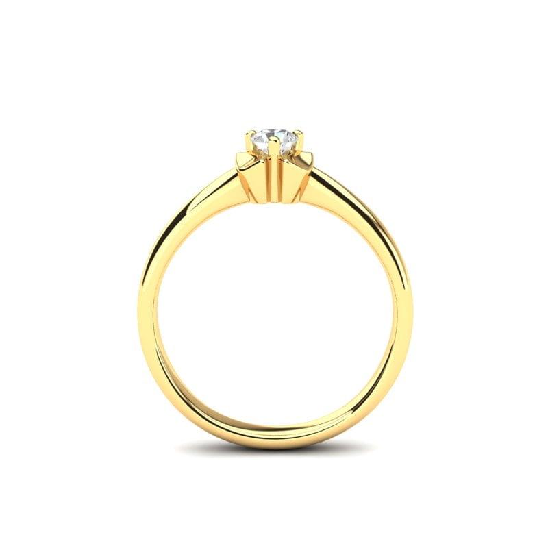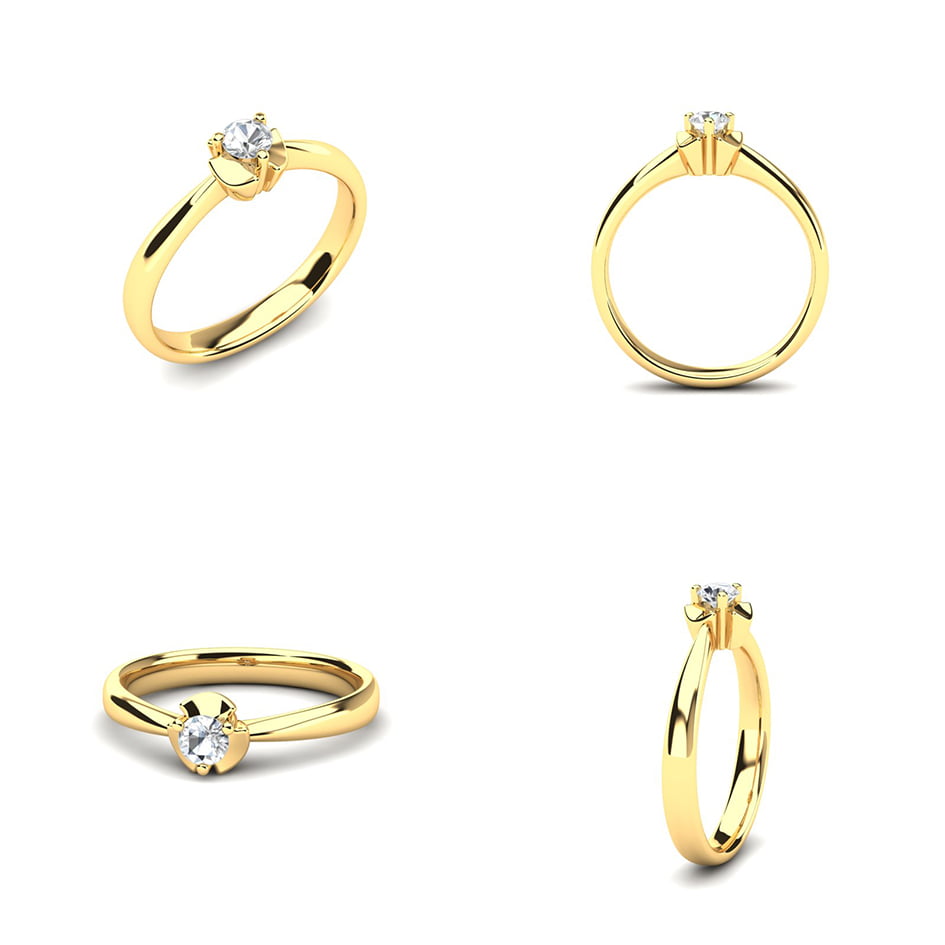 Model vereničkog prstena izrađen od sjajne žute legure zlata. Stilizovani prsten koji poseduje sertifikovani prirodni dijamant, a stvoren da nekome ulepša život. Dijamant okružuju stilizovane krapne, imitujući oblik latica cveta te stvaraju elegantan okvir oko dragog kamena. Krapne su umetnički izvedene sa finim detaljima, koji dodatno ističu lepotu centralnog kamena i dodaju prstenu još veći sjaj. Prsten je delikatan, ali dovoljno upečatljiv da bude pravi statement komad, savršen za posebne prilike ili kao simbol ljubavi i elegancije.