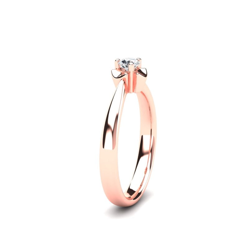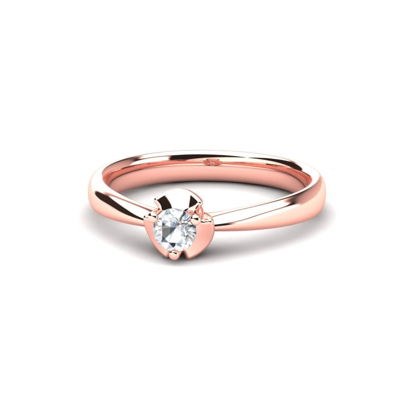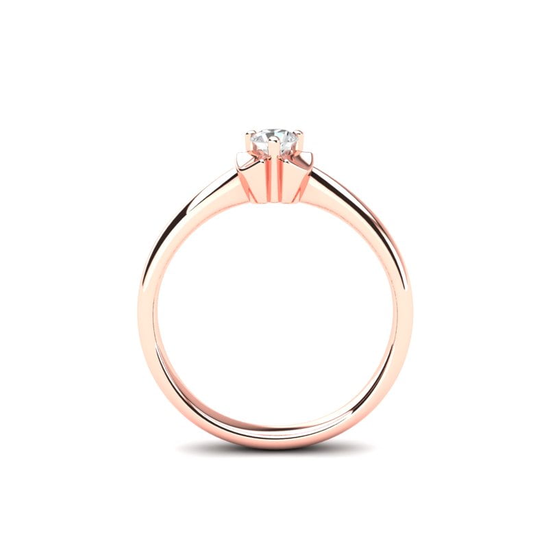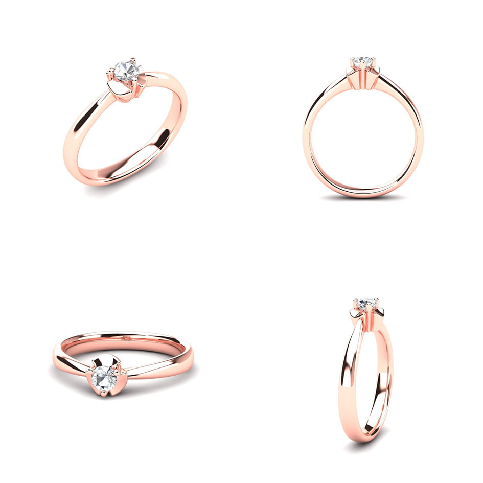 Model vereničkog prstena izrađen od sjajne roze legure zlata. Stilizovani prsten koji poseduje sertifikovani prirodni dijamant, a stvoren da nekome ulepša život. Dijamant okružuju stilizovane krapne, imitujući oblik latica cveta te stvaraju elegantan okvir oko dragog kamena. Krapne su umetnički izvedene sa finim detaljima, koji dodatno ističu lepotu centralnog kamena i dodaju prstenu još veći sjaj. Prsten je delikatan, ali dovoljno upečatljiv da bude pravi statement komad, savršen za posebne prilike ili kao simbol ljubavi i elegancije.