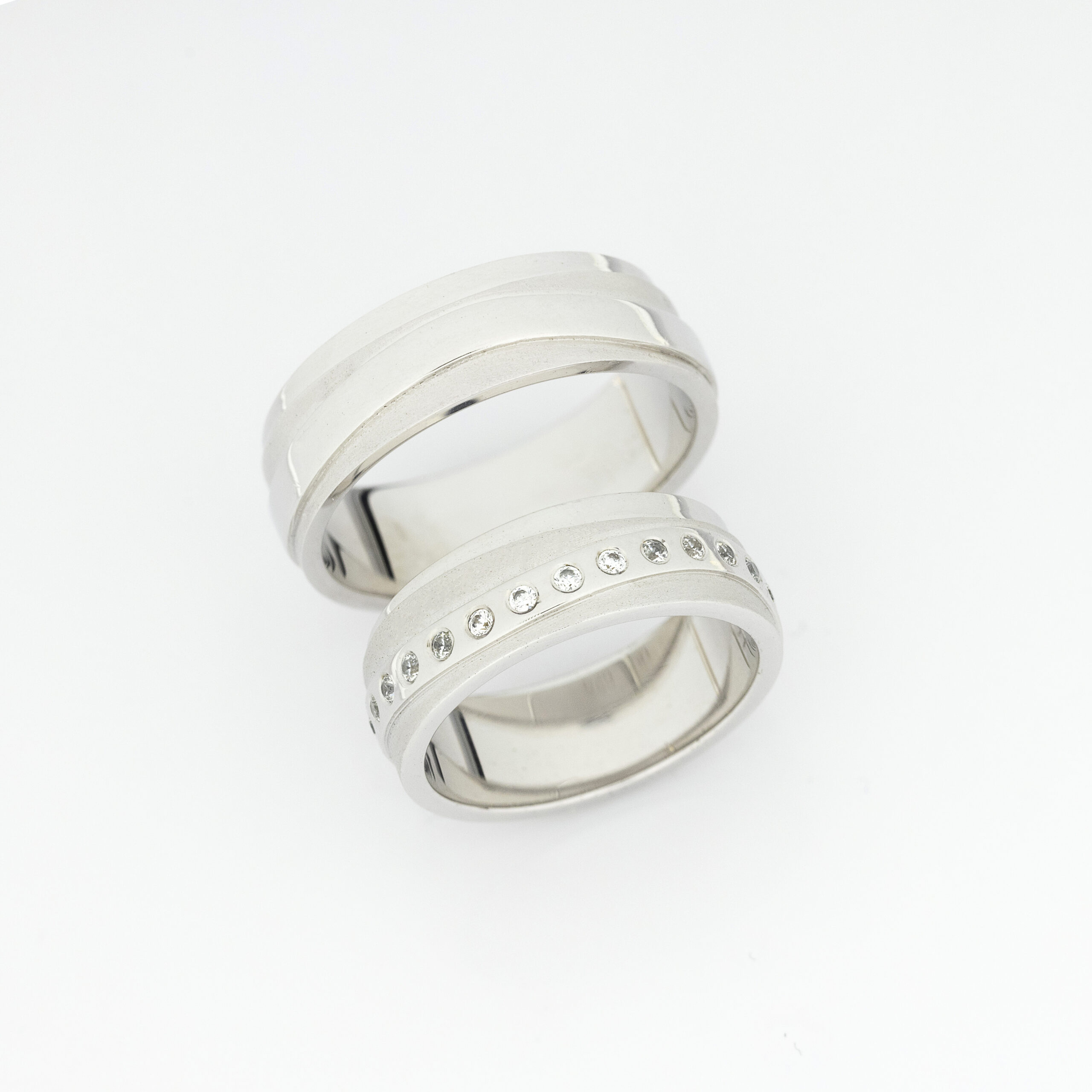 Ove elegantne burme su izrađene od belog zlata, kombinujući mat i sjajnu površinu koje stvaraju izuzetan kontrast i dodaju dubinu njihovom dizajnu. Mat finiš pruža im sofisticiranu teksturu i diskretnu eleganciju, dok sjajna površina donosi luksuzan sjaj. Duž gornje površine burmi protežu se predivni dijamanti, čiji blistavi sjaj dodatno naglašava njihovu izuzetnu izradu. Ove burme su simbol elegancije i izuzetnog ukusa. Idealne su za par koji želi da svoju ljubav obeleži kroz jedinstven i prefinjen komad nakita.
