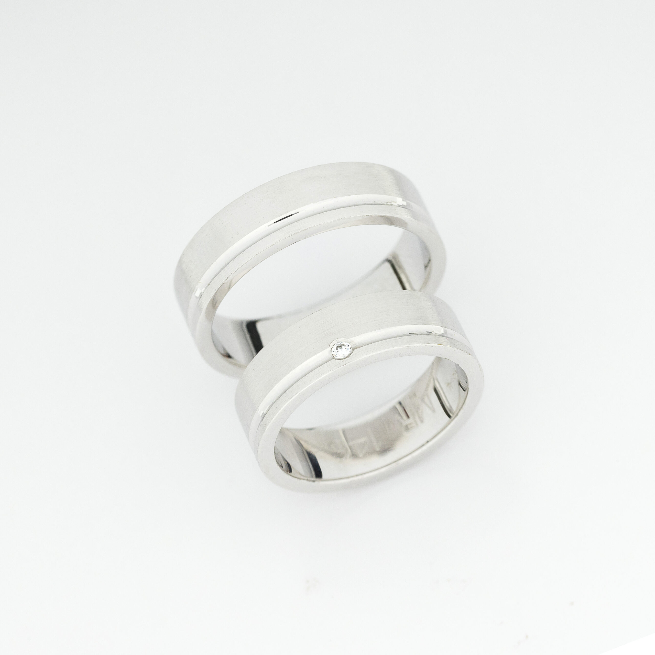 Venčane burme od belog zlata, blago matirane sa sjajnim kanalom i elegantnim dijamantom. Njihov dizajn savršeno balansira između klasičnog i modernog, čineći ih idealnim simbolom trajne ljubavi i veze.
