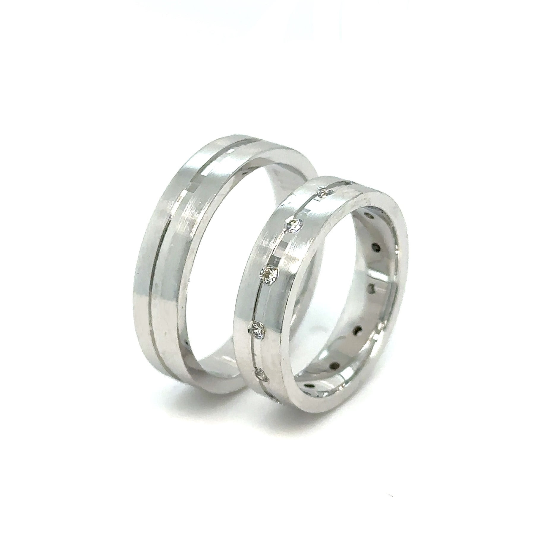Burme od belog zlata, ravan model sa dijamantima po celom obimu, blago matirane i veoma zanimljive. Savršen izbor za one koji žele da istaknu svoju ljubav na poseban način. Ove burme nisu samo simbol večne ljubavi, već i umetničko delo koje će zračiti lepotom i šarmom tokom čitavog života.
