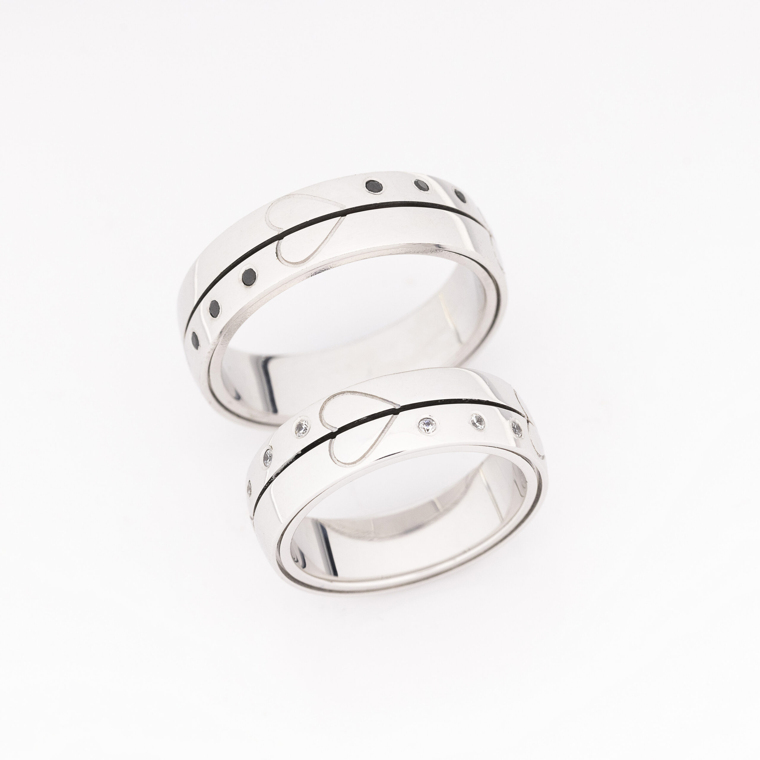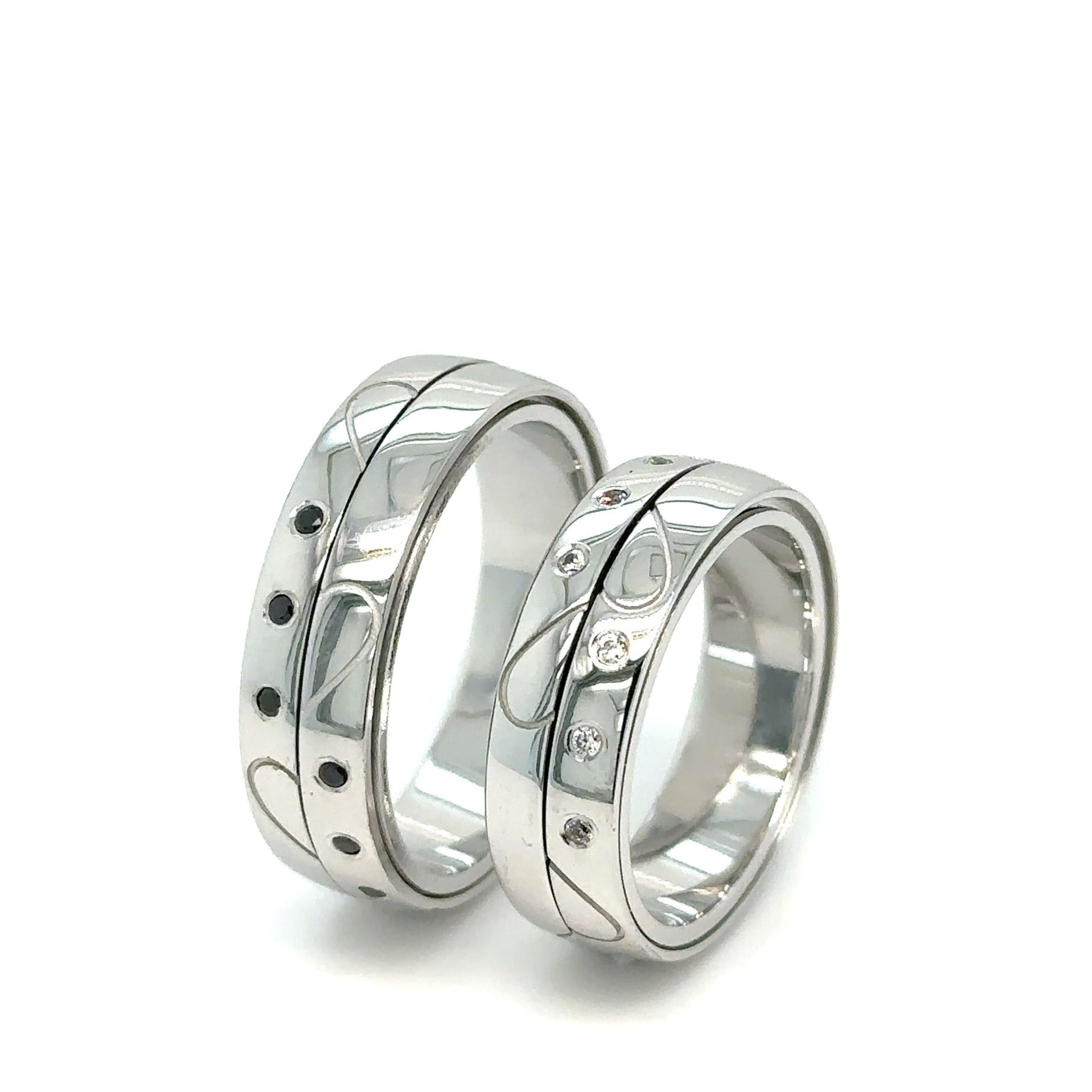 Neobične burme od belog zlata, sa pokretnom levom i desnom stranom, model zanimljivog dizajna, ukrašen dragim kamenjem. Crni dijamanti dodaju dramatičnost i dubinu njihovom dizajnu, dok prirodni dijamanti donose blistav sjaj i sofisticiranost. Kombinacija ovih dragulja stvara efektnu simbiozu između moderne estetike i klasične elegancije. Ove burme su savršen izbor za par koji želi da izrazi svoj jedinstveni stil i duboku ljubav kroz luksuzan i istovremeno suptilan dizajn.