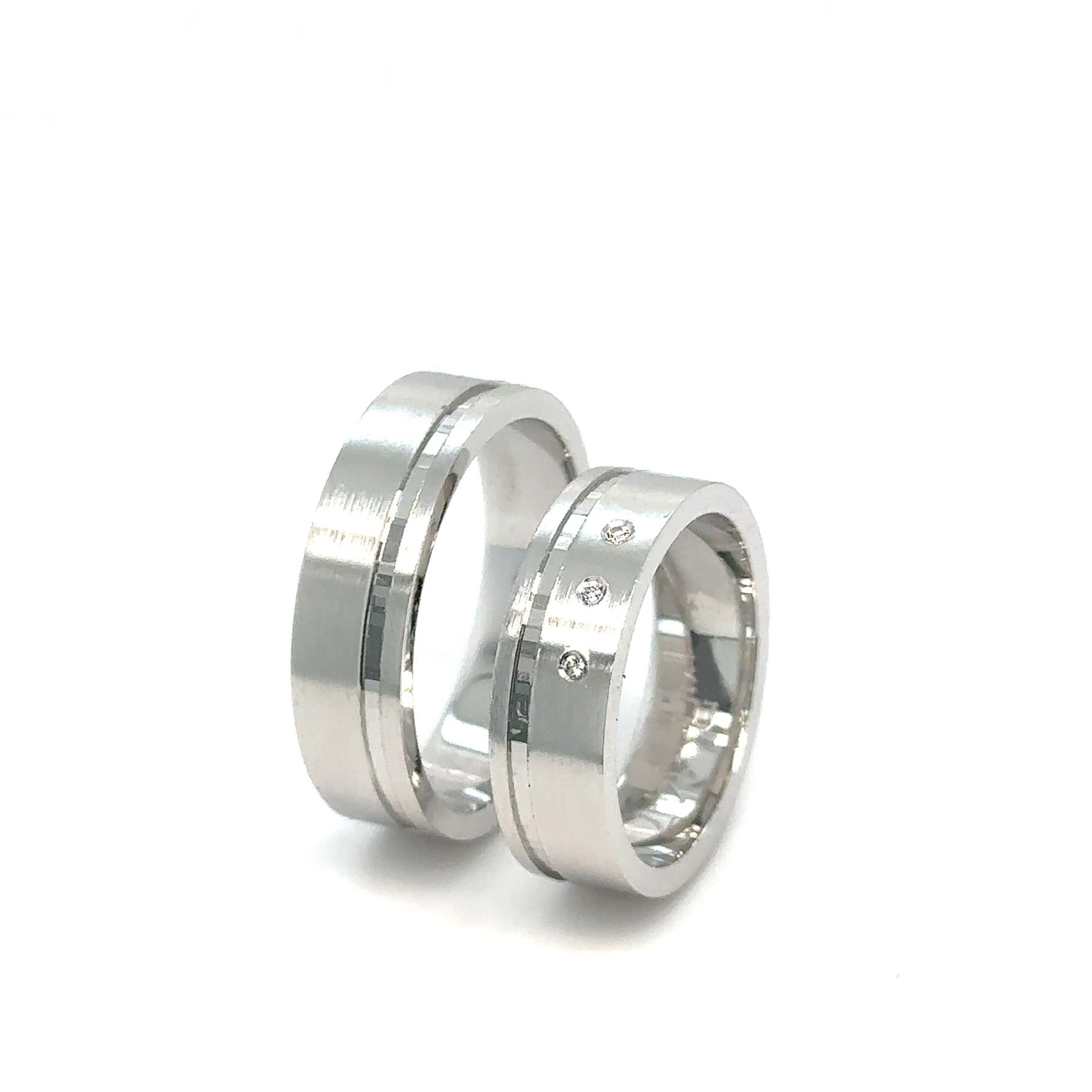 Efektne burme širine 6.0 mm, izrađene od belog zlata gde mat površina dominira, a tri dijamanta diskretno svetlucaju. Dizajnirane da traju generacijama, ove burme su savršen izraz vaše večne ljubavi i posvećenosti.