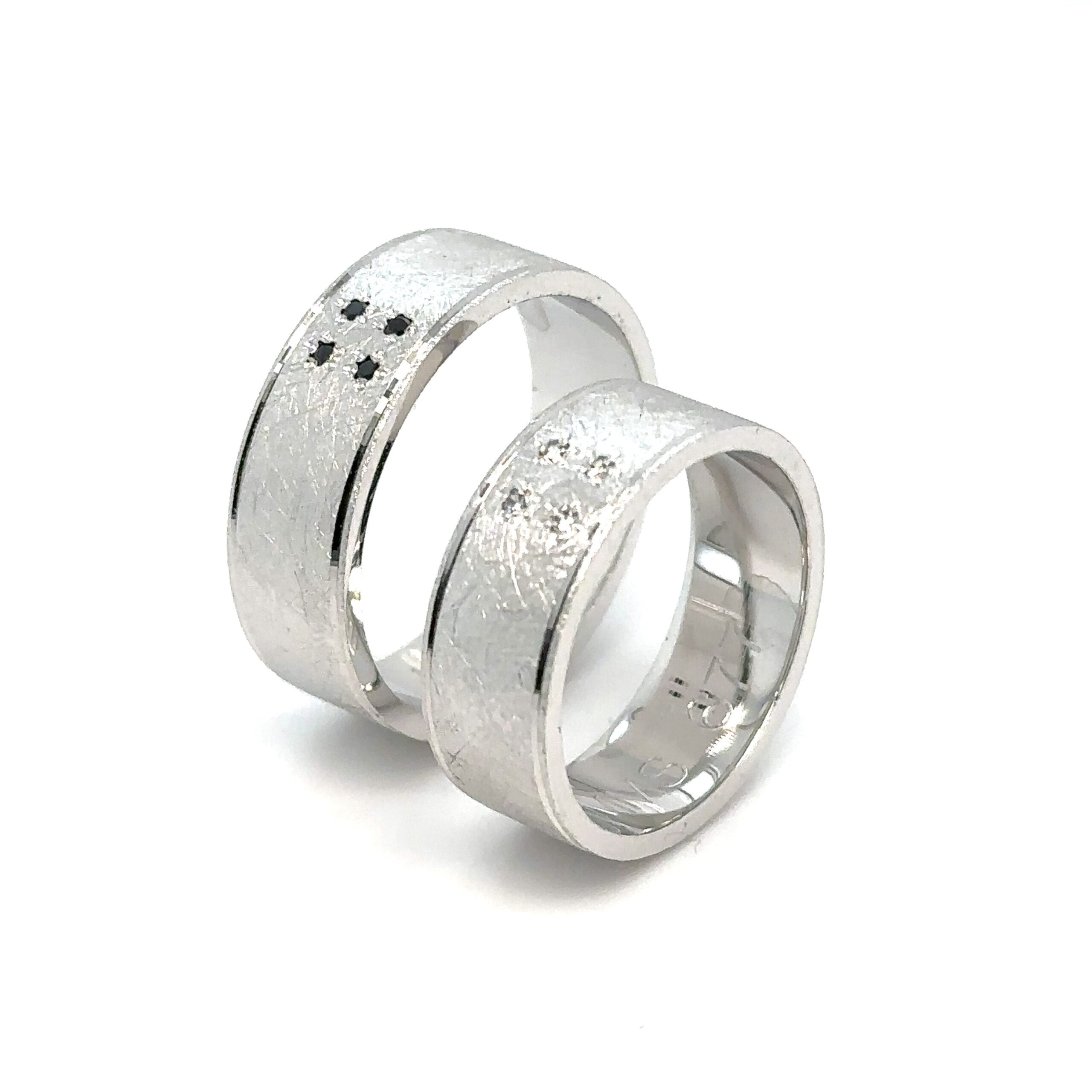 Venčane burme zanimljive površinske obrade, izrađene od belog zlata i oplemenjene dragim kamenjem kao simbolom večnosti. Savršene za izražavanje večne ljubavi i posvećenosti, nude savršen balans između sofisticiranosti i ličnog stila.