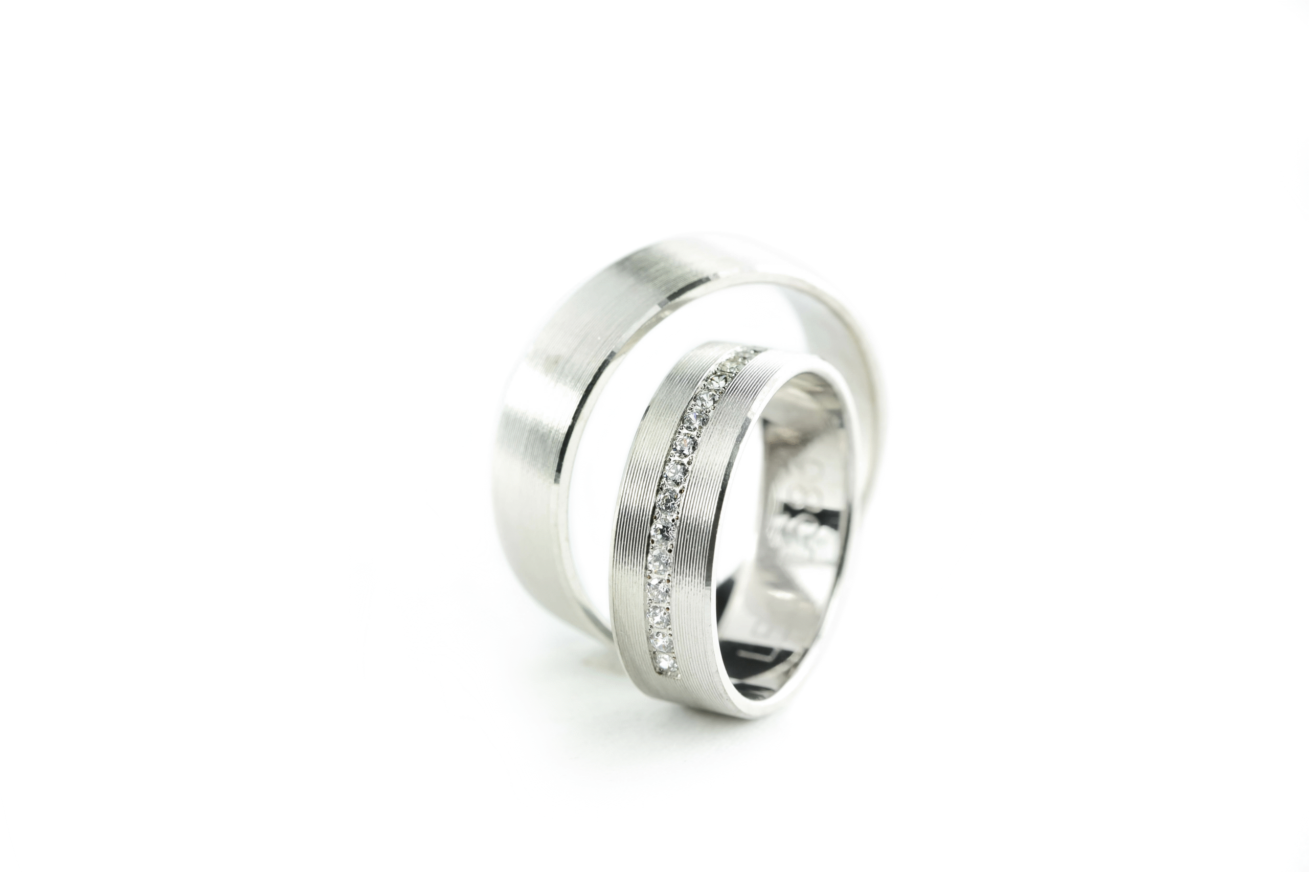 Ove burme izrađene su od belog zlata širine 6 mm, sa karakterističnom fino brušenom završnicom duž cele površine. Muška burma odiše snagom i jednostavnošću, sa jasnim linijama i izraženom teksturom koja daje moderan izgled. Ženska burma krasi linija od 15 dijamanata, precizno ufasovanih u središnjem delu prstena. Dizajn ovih burmi savršeno kombinuje snagu i suptilni sjaj, idealan za parove sa snažnim, ali nežnim izrazom ljubavi.