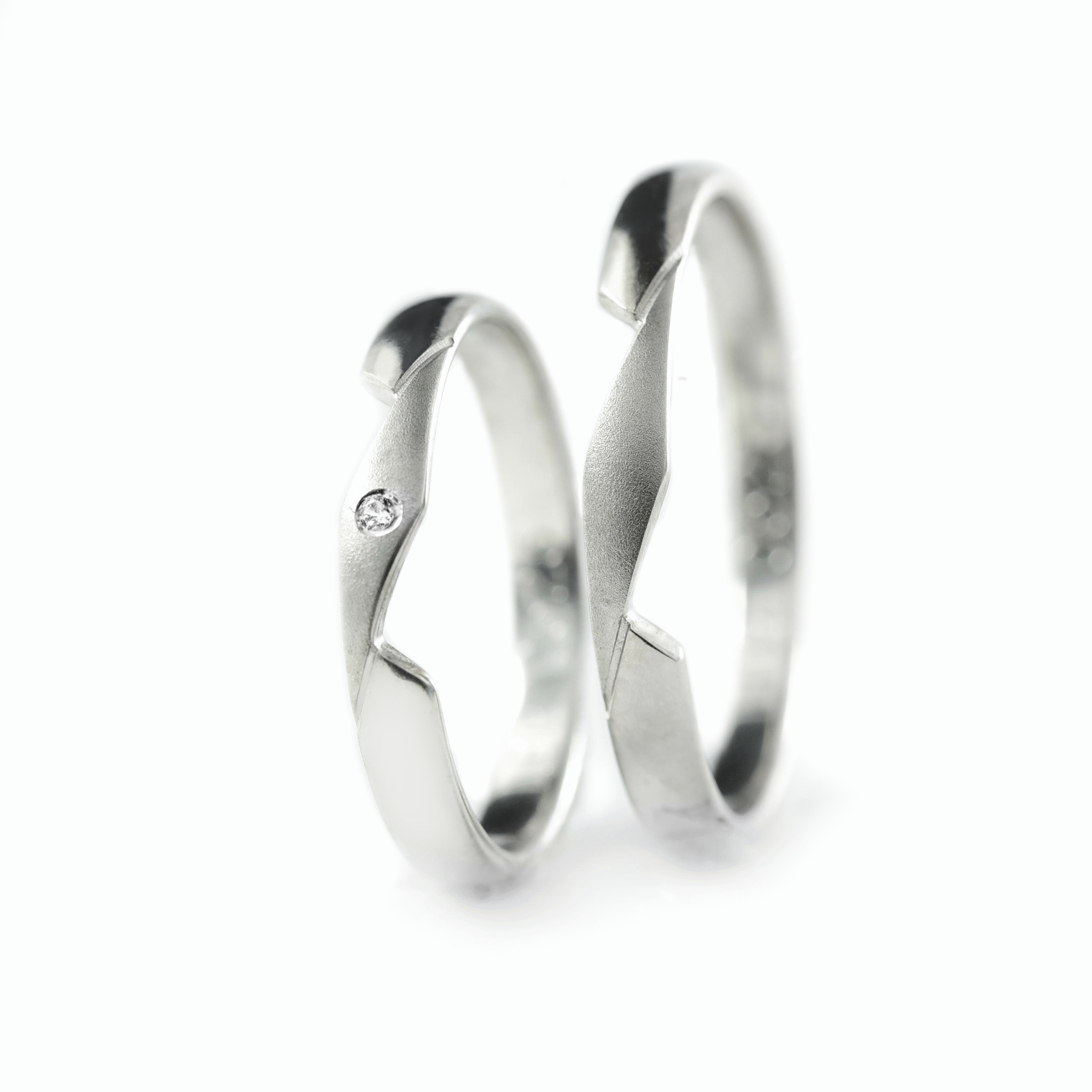 Ove burme izrađene su od belog zlata širine 2.5 mm, sa jedinstvenim dizajnom koji se savršeno uklapa kada su spojene. Muška burma ima matiranu površinu u centru i elegantnu liniju sa modernim, oštrim sečenjem koje joj daje karakter i dinamiku. Ženska burma prati isti oblik, ali je dodatno ukrašena jednim dijamantom za suptilan svetlucavi akcenat. Simbol savršene povezanosti, ove burme su idealan izbor za parove koji žele nešto drugačije, originalno i duboko lično.