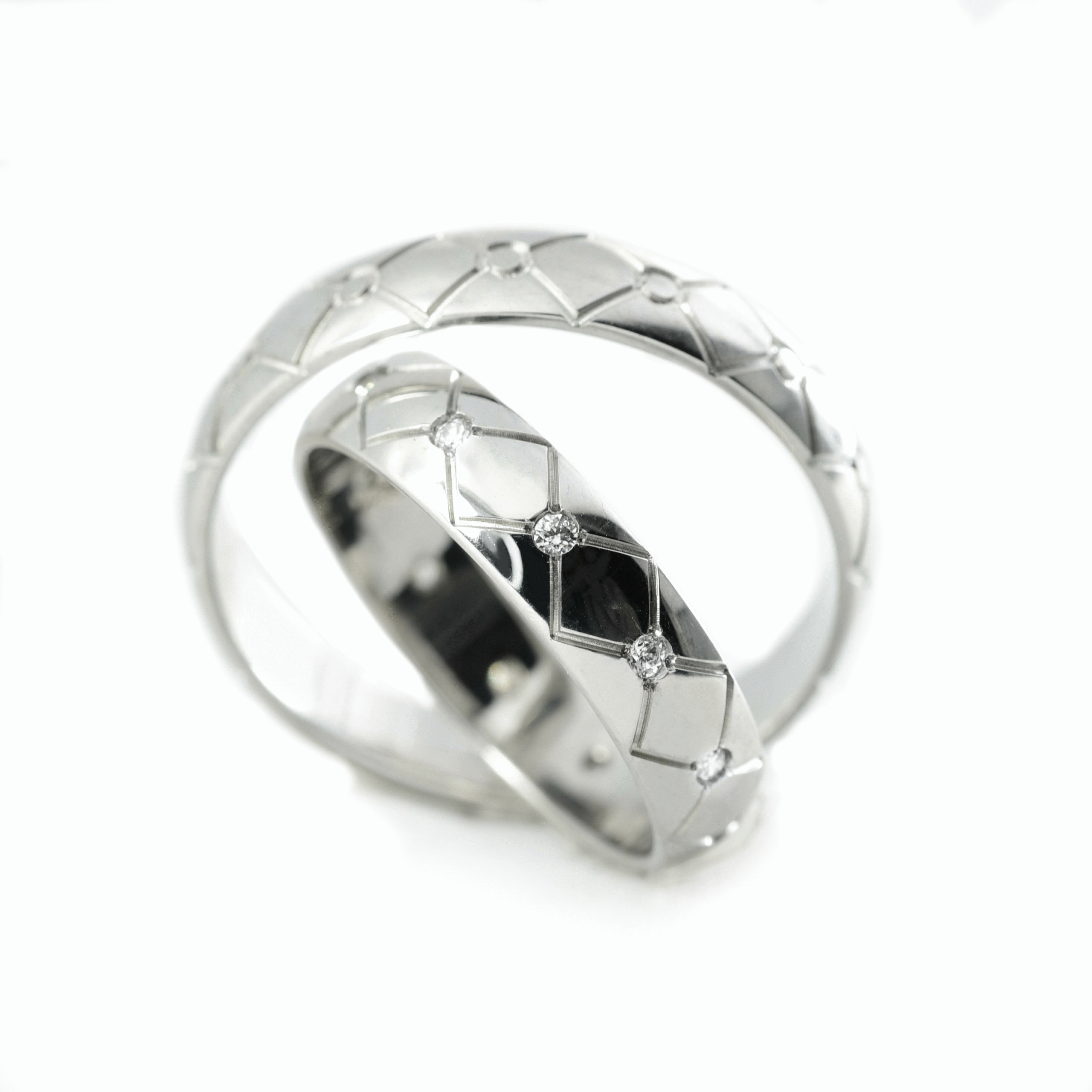 Ove burme izrađene su od belog zlata širine 4.5 mm, sa visokim sjajem i upečatljivim graviranim romboidnim uzorkom. Muška burma odiše snagom i sofisticiranošću, sa reljefnim šarama koje joj daju izražen karakter i originalan izgled. Ženska burma krasi isti geometrijski motiv, ali je dodatno ukrašena sa 12 briljanata, raspoređenih simetrično. Ove burme predstavljaju sklad strukture i svetlucavih detalja, savršen izbor za parove koji žele jedinstven i prepoznatljiv dizajn.
