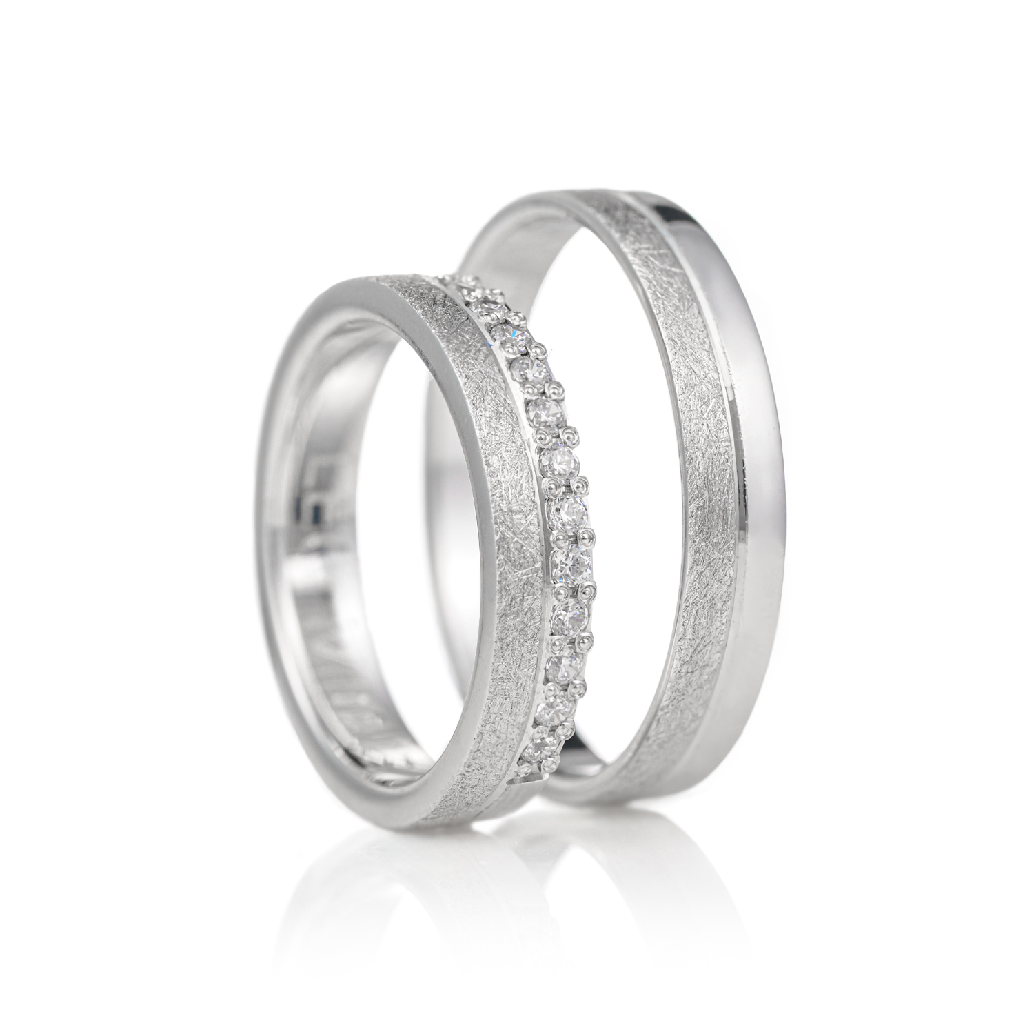 Ove burme izrađene su od belog zlata širine 4 mm, sa kombinovanom završnom obradom koja spaja matiranu i sjajnu površinu. Muška burma ima diskretan, ali izražajan izgled, sa teksturisanom središnjom zonom u kontrastu sa glatkim, poliranim ivicama. Ženska burma krasi 15 briljanata, smeštenih u nizu duž centralne matirane površine za dodatni sjaj. Ovaj par burmi spaja savremenu eleganciju, bogatstvo detalja i skladnu simboliku, idealan za parove sa izraženim stilom.