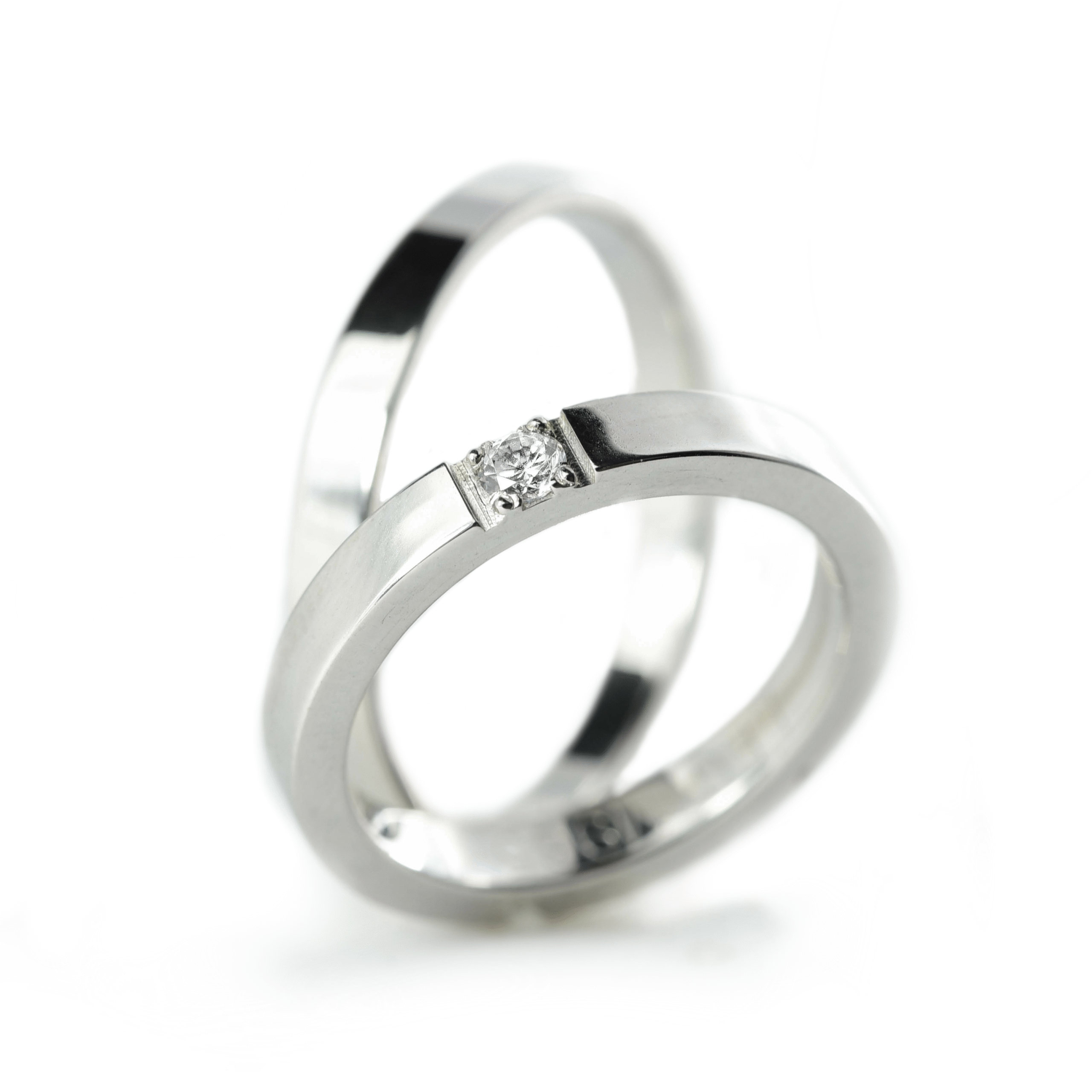 Ove burme izrađene su od belog zlata širine 3 mm, sa elegantno ravnim površinama i visoko poliranom završnicom. Muška burma odiše jednostavnošću i savremenom geometrijom – idealna za one koji vole čist, moderan izraz. Ženska burma prati istu formu, ali je ukrašena jednim centralnim brilijantom za snažan vizuelni akcenat. Minimalizam i preciznost u ovom dizajnu simbolizuju čvrstu povezanost, čineći ove burme savršenim izborom za moderne parove.
