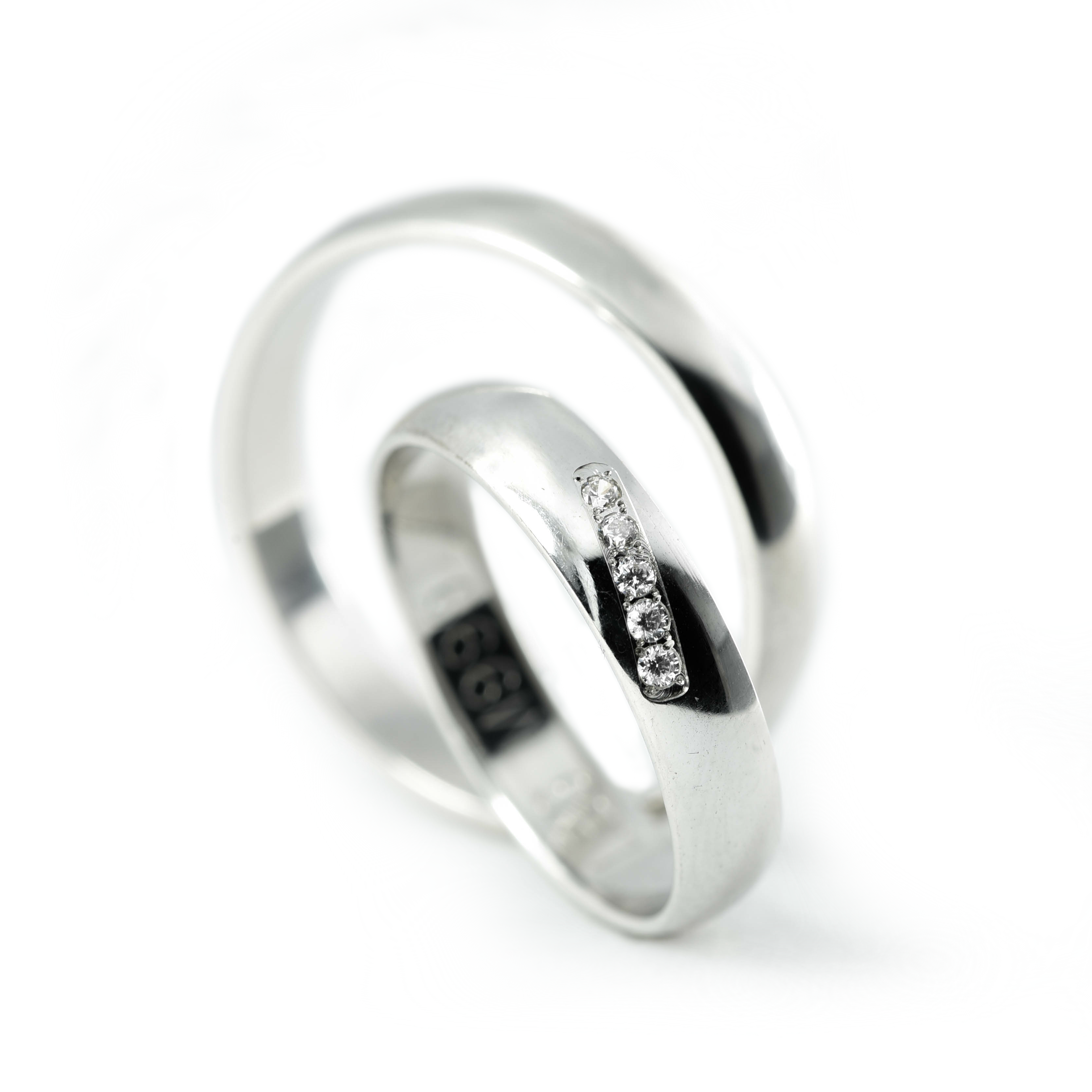 Ove burme izrađene su od belog zlata širine 4 mm sa elegantnom, visoko poliranom završnicom. Muška burma ima jednostavan, ali upečatljiv dizajn koji kombinuje klasičnu formu i moderan sjaj. Ženska burma ukrašena je sa pet briljanata postavljenih u diskretnu, vertikalnu liniju za suptilan svetlucavi akcenat. Ove burme savršen su izbor za parove koji žele eleganciju sa dozom savremenog luksuza i simbolike.