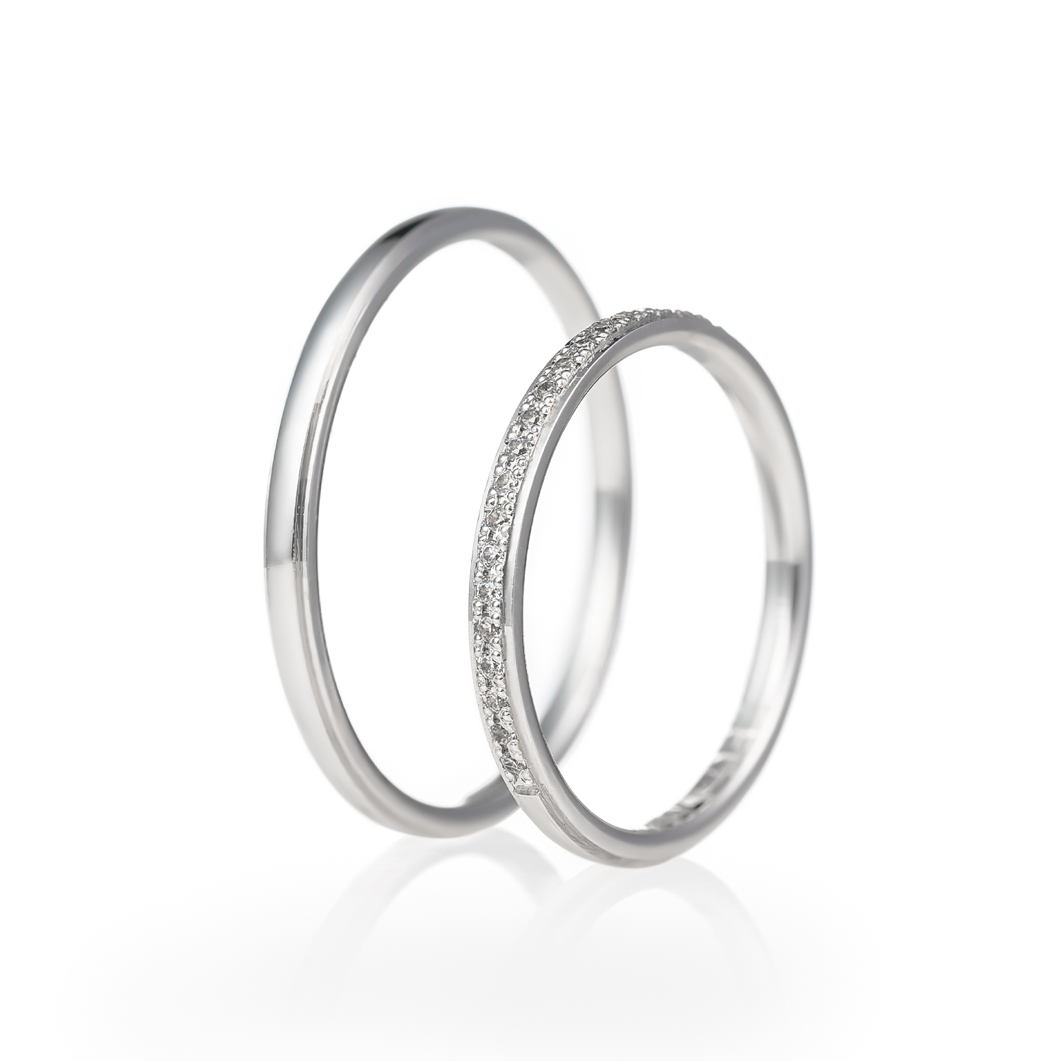 Ove burme izrađene su od belog zlata širine 2 mm, sa izuzetno prefinjenim i minimalističkim dizajnom koji odiše elegancijom. Muška burma ima jednostavnu, visoko poliranu završnicu – savršen izbor za one koji vole diskretan i klasičan stil. Ženska burma ukrašena je sa 23 sitna briljanta, pažljivo postavljena u tankoj liniji duž cele površine za besprekoran sjaj. Ove burme idealne su za parove koji žele lagan, sofisticiran i istovremeno upečatljiv simbol večne ljubavi i povezanosti.