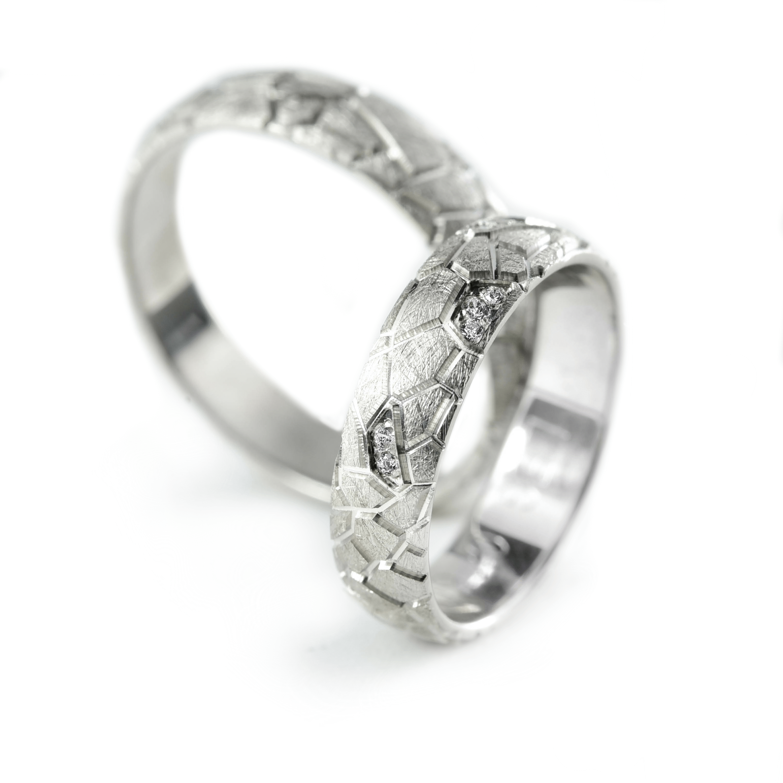 Ove burme od belog zlata širine 5 mm donose autentičan spoj teksture i sjaja. Muška burma ima izraženu mozaik šaru sa matiranom površinom koja odiše snagom, karakterom i modernim izrazom. Ženska burma prati isti dizajn, ali je dodatno obogaćena sa devet dijamanata, koji svetlucaju među reljefnim linijama. Ovaj par je savršen za parove koji žele umetnički, drugačiji i izražajan simbol svoje ljubavi.
