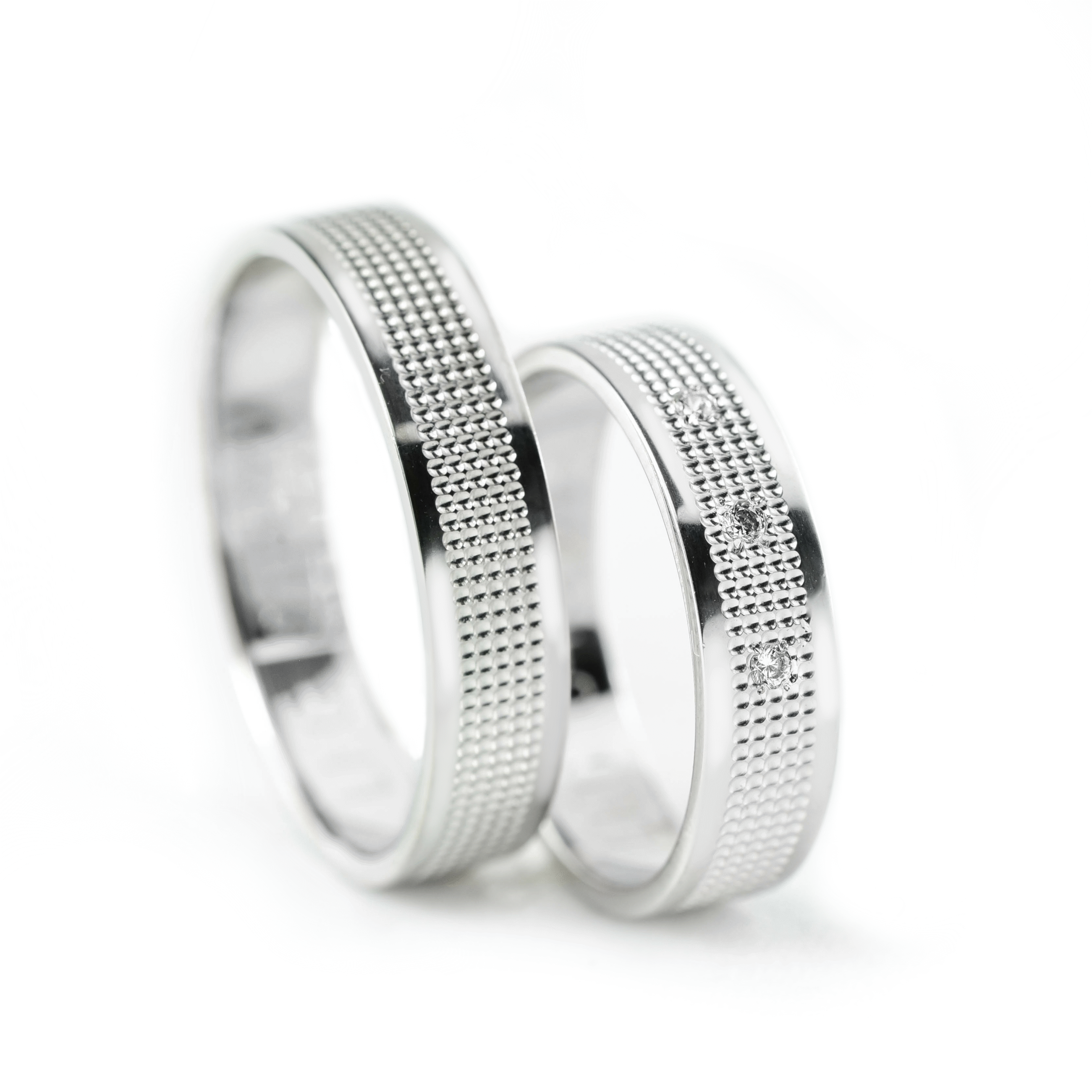 Ove burme od belog zlata širine 5 mm donose moderan izgled sa izraženim teksturalnim efektom i klasičnom formom. Muška burma krasi se preciznim reljefnim motivom duž čitave površine, pružajući sofisticiran i upečatljiv izgled. Ženska burma zadržava isti dezen, ali je dodatno naglašena sa tri diskretna dijamanta koji donose dozu sjaja i elegancije. Idealan izbor za parove koji vole uredan, stilizovan dizajn sa suptilnim luksuzom.