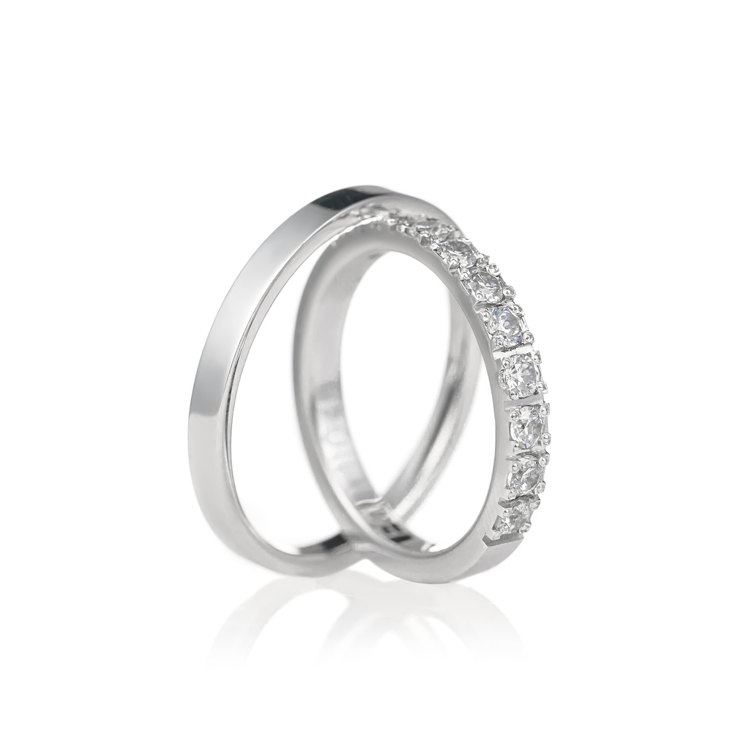 Ove burme izrađene su od belog zlata, sa glatkom i sjajnom završnicom koja odiše čistom elegancijom. Muška burma jednostavna je i klasična, idealna za one koji preferiraju diskretan, ali sofisticiran dizajn bez detalja. Ženska burma ukrašena je nizom od 10 briljanata, koji daju raskošan, ali nežan sjaj. Kombinacija minimalizma i luksuza čini ove burme savršenim izborom za parove sa izraženim osećajem za stil i simboliku.