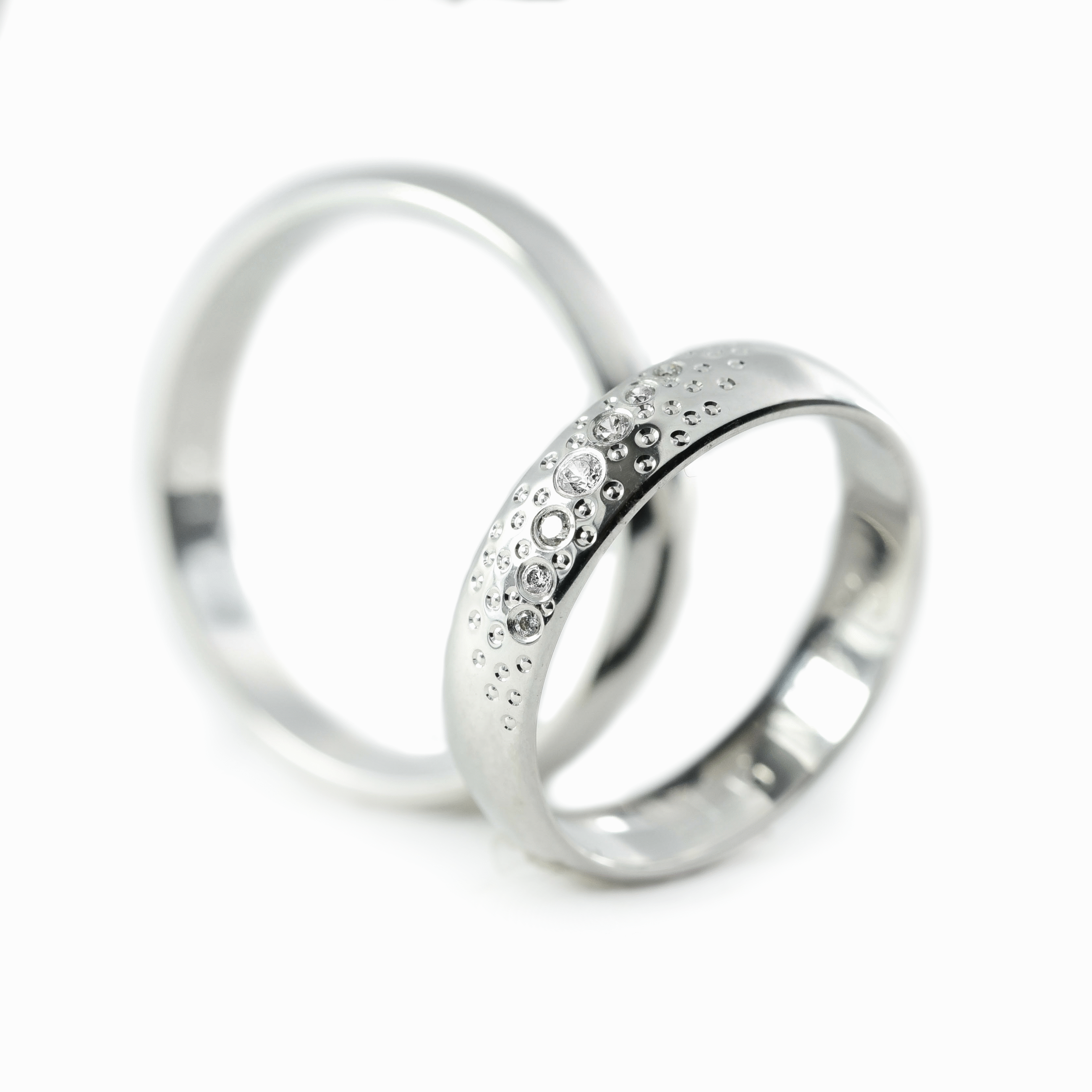 Ove burme od belog zlata širine 4.5 mm odišu originalnošću i razigranim duhom. Muška burma ima jednostavnu, blago zaobljenu formu sa diskretnim sjajem, dok ženska donosi eksploziju svetlucavih detalja — kombinaciju sedam dijamanata različitih veličina postavljenih u raspršenom, dinamičnom rasporedu. Inspirisane kapima kiše koje padaju na mirnu površinu, ove burme simbolizuju emocije koje rastu i prelivaju se. Idealne su za parove koji žele jedinstven, nežan i umetnički izraz ljubavi.