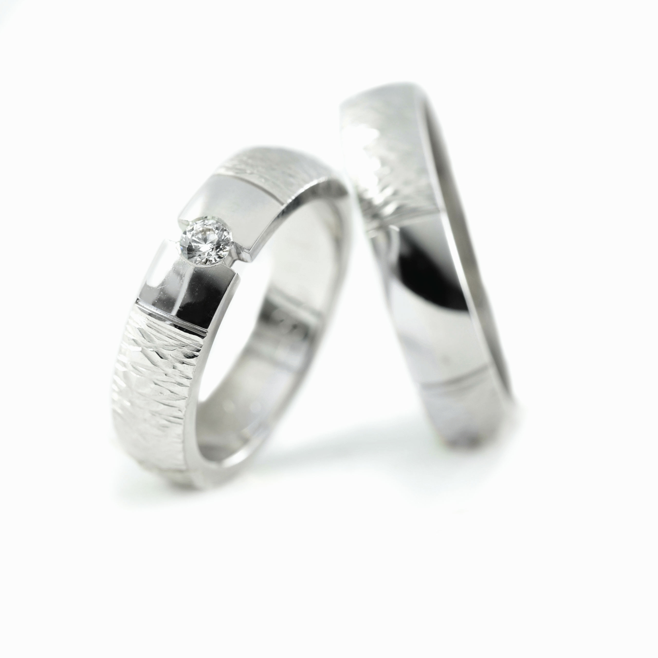 Ove burme od belog zlata širine 5 mm donose snažan vizuelni identitet kroz kontrast tekstura i svetlucavih površina. Muška burma kombinuje mat i visoko poliranu završnu obradu za moderan, ali klasičan izraz. Ženska burma deli isti dizajn, ali je dodatno obogaćena upečatljivim centralnim dijamantom u elegantnom, otvorenom okovu. Idealan su izbor za parove koji žele simbol ljubavi sa snažnim karakterom i sofisticiranim detaljem.