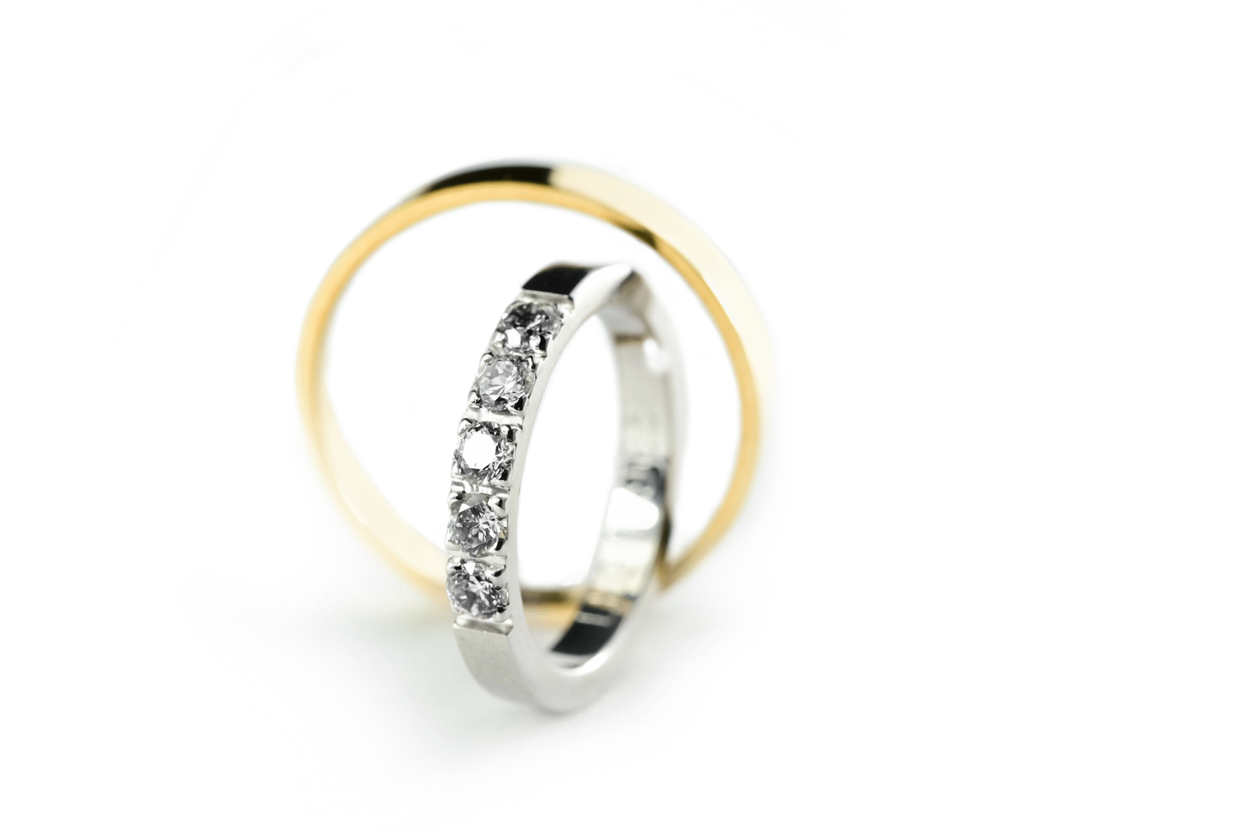 Ove burme izrađene su od zlata širine 3 mm i osmišljene da predstave skladnu kombinaciju klasike i luksuza. Muška burma od žutog zlata ima visoko poliranu površinu koja ističe toplinu i prefinjenost tradicionalnog izraza. Ženska burma izrađena je od belog zlata i ukrašena sa pet briljanata postavljenih u uredan i simetričan niz. Dijamanti dodatno naglašavaju svetlucav akcenat, dok geometrijski raspored pruža balans i sofisticiran vizuelni efekat. Ove burme savršen su izbor za parove koji žele suptilan spoj elegancije, simbolike i modernog dizajnerskog pristupa.