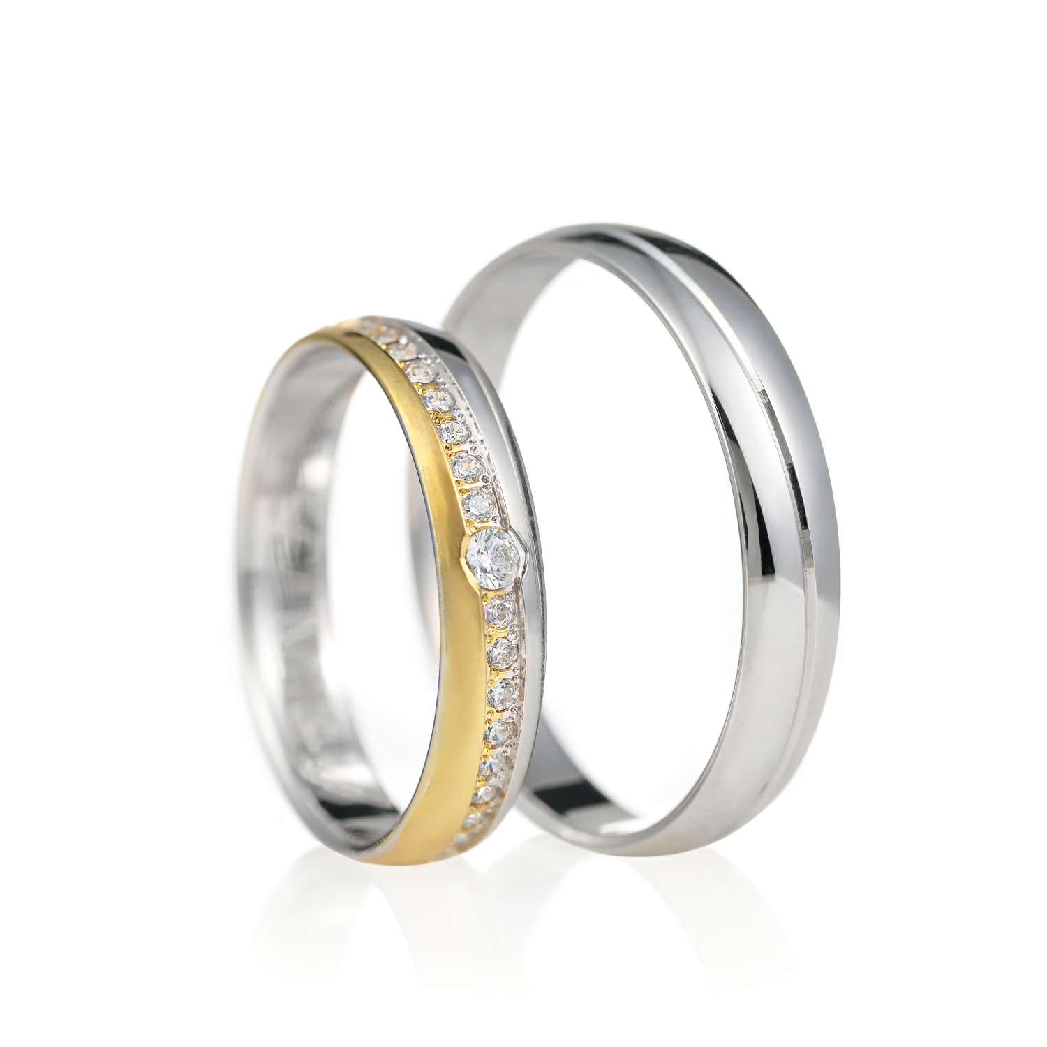 Ove burme od zlata širine 4 mm kombinuju eleganciju i simboliku kroz moderan, ali sofisticiran dizajn u dvobojnoj izvedbi. Muška burma od belog zlata ima glatku, visoko poliranu površinu, dok žensku krasi kombinacija belog i žutog zlata. Jedan centralni dijamant i niz manjih duž linije dodaju sjaj i luksuzan akcenat. Savršen izbor za parove koji žele burme sa ličnim pečatom, stilom i upečatljivim vizuelnim balansom.