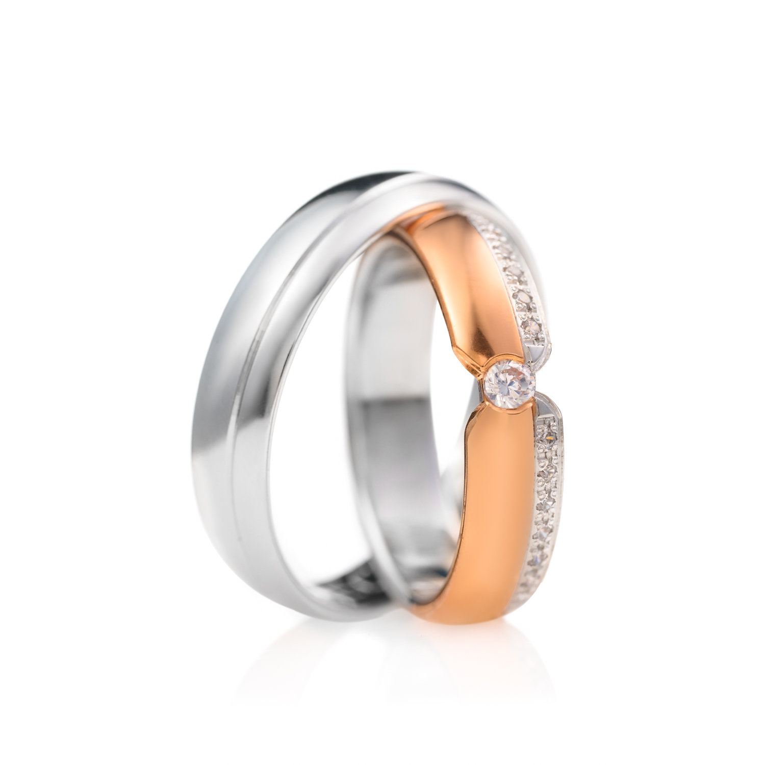 Burme od zlata širine 5 mm donose savremen spoj nežnosti, kontrasta i besprekornog sjaja. Muška burma od belog zlata ima zaobljen, jednostavan dizajn sa diskretnom, elegantnom formom. Ženska burma kombinuje belo i roze zlato, ukrašena je sa 15 dijamanata i centralnim, većim kamenom. Simbolizuju povezanost, sklad i blistavost ljubavi u svakom pogledu.