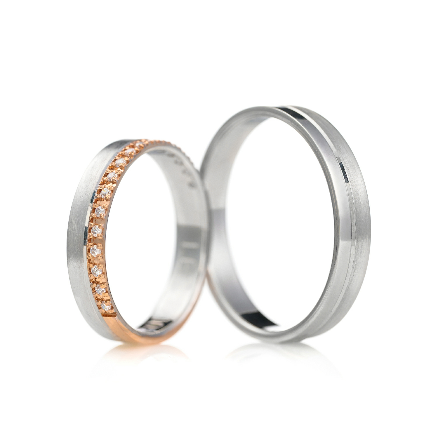 Muška burma od belog zlata ima matiranu završnu obradu sa sjajnim kanalićem po sredini za moderan izgled. Ženska burma kombinuje belo i roze zlato, ukrašena je sa 17 dijamanata postavljenih duž ivice u elegantnoj liniji. Obe burme odišu savremenim dizajnom i prefinjenom elegancijom, idealne za parove koji vole diskretan luksuz.