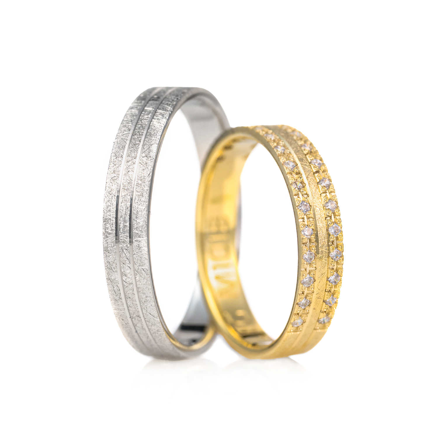 Ove burme izrađene su od zlata širine 4 mm, sa upečatljivom kombinacijom tekstura i boja. Muška burma od belog zlata ima dve paralelne linije i peskiranu završnicu koja joj daje rustičan, ali moderan izgled. Ženska burma izrađena je od žutog zlata, a dodatno je ukrašena sa 30 briljanata postavljenih u dvostruki niz duž gornje i donje ivice. Kontrast između sirove teksture i luksuznog sjaja dijamanata čini ove burme simbolom snage, svetlosti i uravnotežene ljubavi.