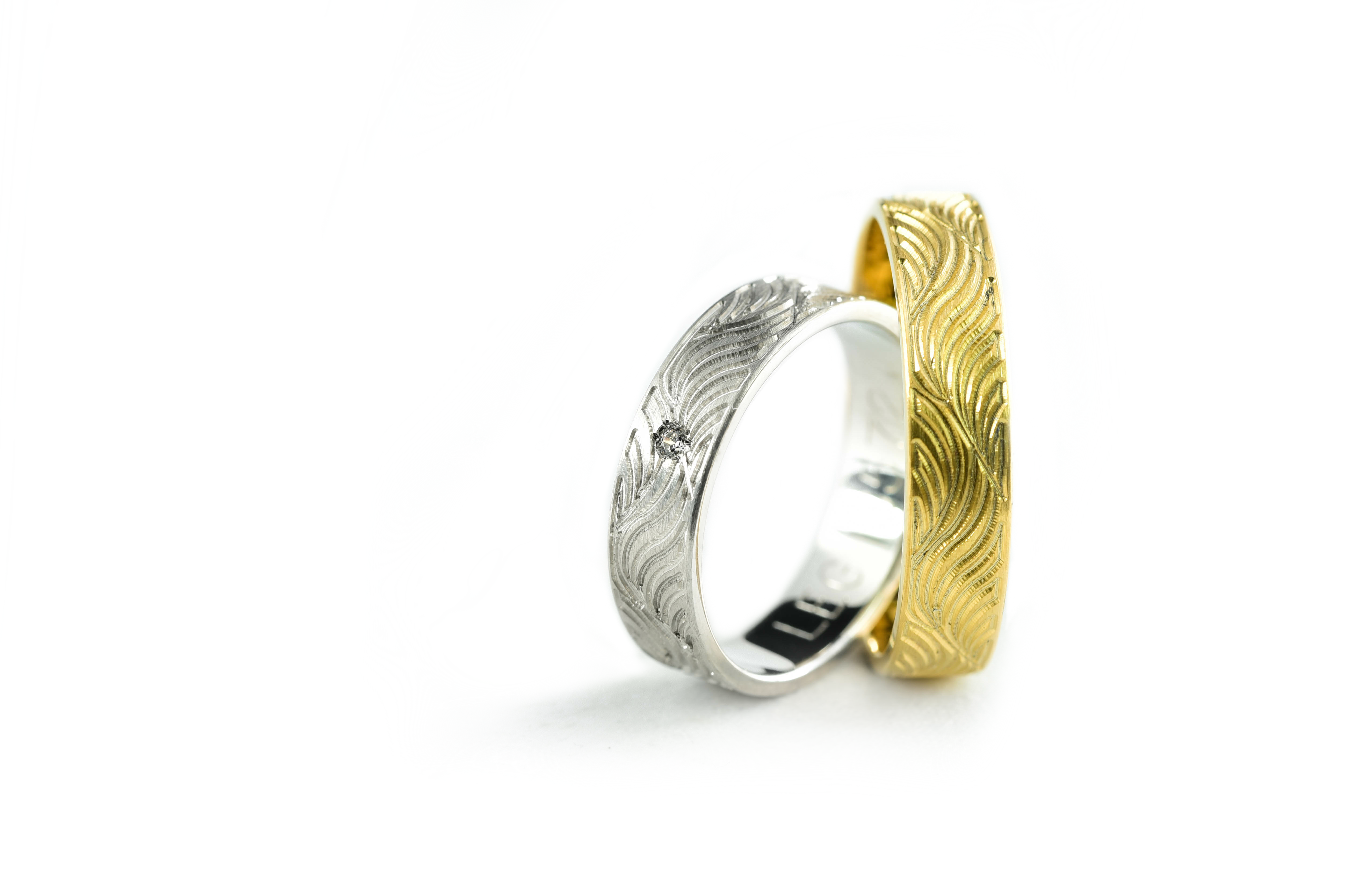 Ove burme izrađene su od zlata širine 5 mm, sa reljefnim uzorkom talasa koji simbolizuje tok i snagu života. Muška burma od žutog zlata odiše karakterom, dok žensku burmu od belog zlata krasi dijamant za dozu elegancije. Spoj teksture i sjaja čini ovaj par burmi savršenim za parove koji žele originalan, simboličan i stilizovan dizajn.