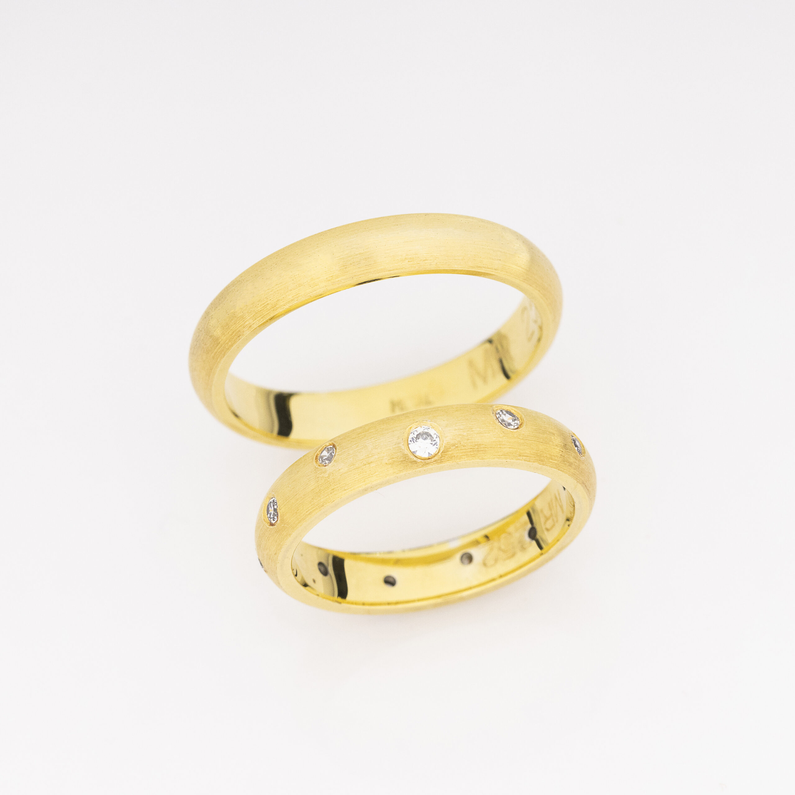Engleske burme od žutog zlata, mat površinske obrade metala, sa dijamantima raspoređenim po celom obimu ženskog modela, širine 4.0 mm. Burme odišu bezvremenskom elegancijom i toplinom klasičnog dizajna. Njihova suptilna površina pruža diskretan, sofisticiran sjaj. Ovaj spoj jednostavnosti i blistavih detalja čini ih savršenim simbolom ljubavi i zajedništva, namenjen parovima koji cene sklad tradicije i modernog izraza.