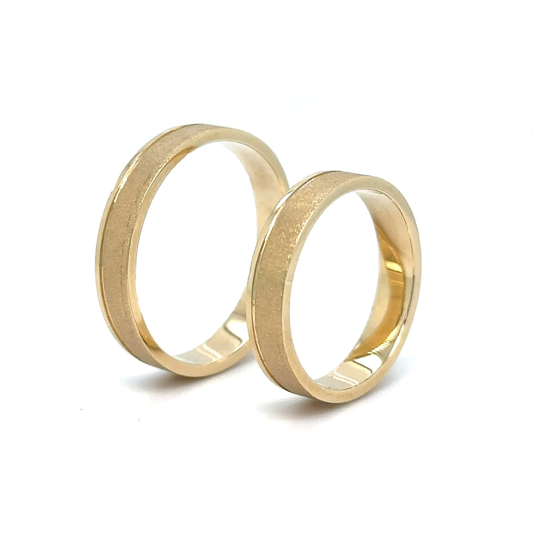 Savršene burme od žutog zlata, gde je površinska obrada mat sa sjajnim završnim delom. Ravan model burmi od mat žutog zlata odiše diskretnom elegancijom i minimalističkim šarmom. Njihova jednostavna, čista linija naglašena je suptilnim mat finisom koji daje sofisticiranu, nenametljivu teksturu i blagi sjaj. Ove burme su savršen izbor za parove koji cene tradicionalni dizajn sa modernim, stilizovanim detaljem, simbolizujući trajnu i čistu ljubav bez suvišnih ukrasa.