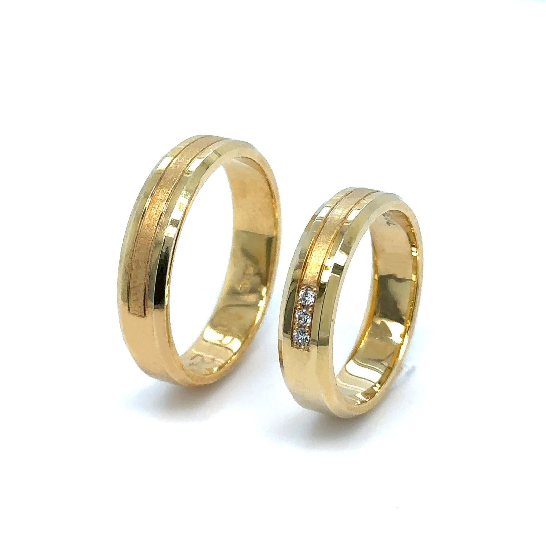 Burme izrađene od luksuznog žutog zlata, ukrašene prirodnim dijamantima koji pružaju izuzetan kontrast i eleganciju. Mat detalji dodaju dramatičnost i dubinu njihovom dizajnu, dok prirodni dijamanti donose blistav sjaj i sofisticiranost. Ove burme su savršen izbor za par koji želi da izrazi svoj jedinstveni stil i duboku ljubav kroz luksuzan dizajn.
