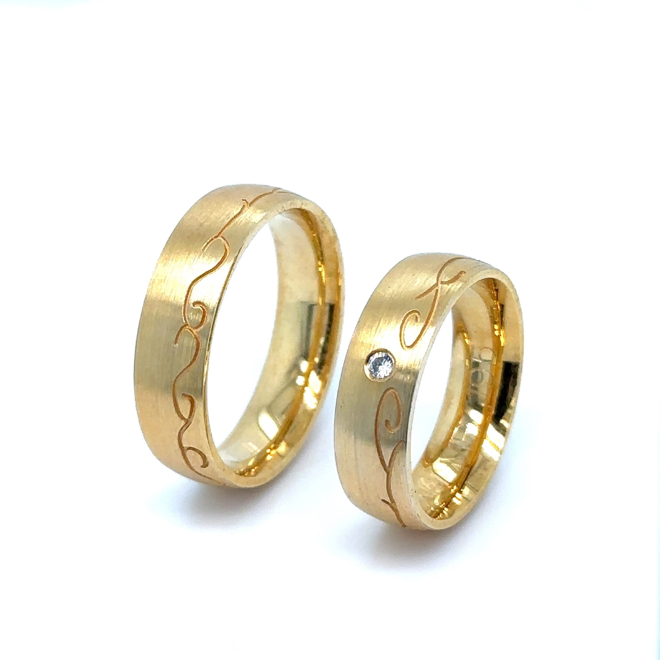 Venčane burme od žutog zlata, model posebne lepote, ukrašen prirodnim dijamantom koji garantuje blagostanje i večnu ljubav. Ove burme su savršen izbor za parove koji cene tradicionalni dizajn sa modernim, stilizovanim detaljem, simbolizujući trajnu i čistu ljubav.