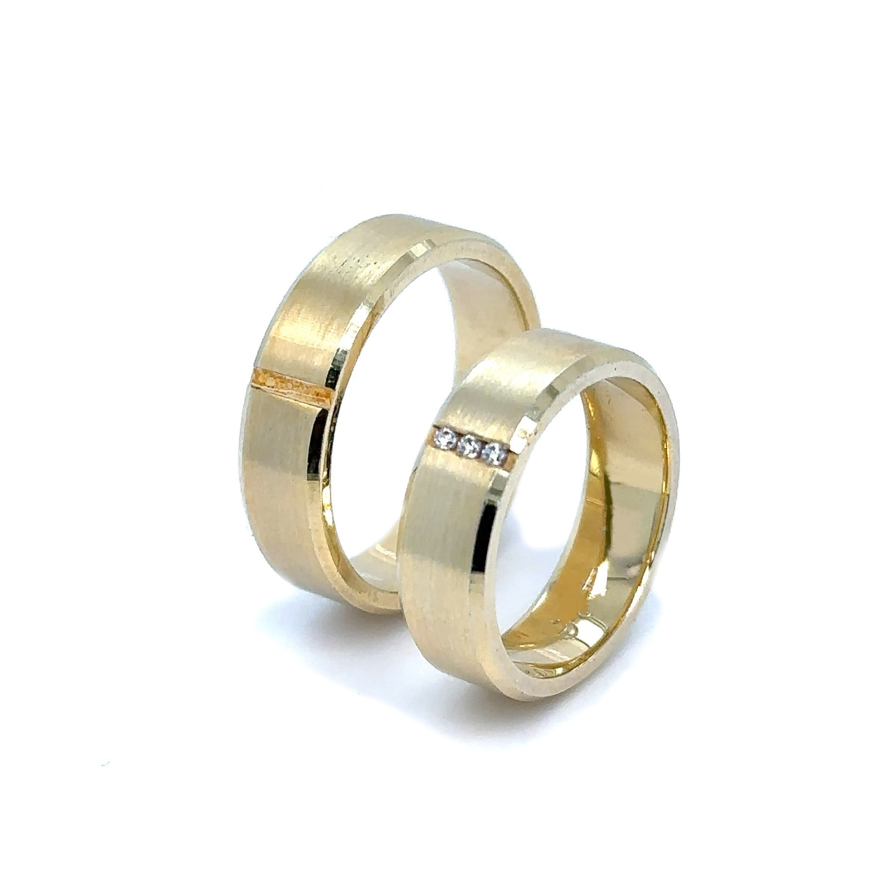 Elegantne burme od žutog zlata, model koji odiše stilom, sa dijamantima koji neodoljivo blistaju. Zanimljiv model burmi od mat žutog zlata odiše diskretnom elegancijom i minimalističkim šarmom. Njihova jednostavna, čista linija naglašena je suptilnim mat finisom koji daje sofisticiranu, nenametljivu teksturu i blagi sjaj. Ove burme su savršen izbor za parove koji cene tradicionalni dizajn sa modernim, stilizovanim detaljem, simbolizujući trajnu i čistu ljubav.
