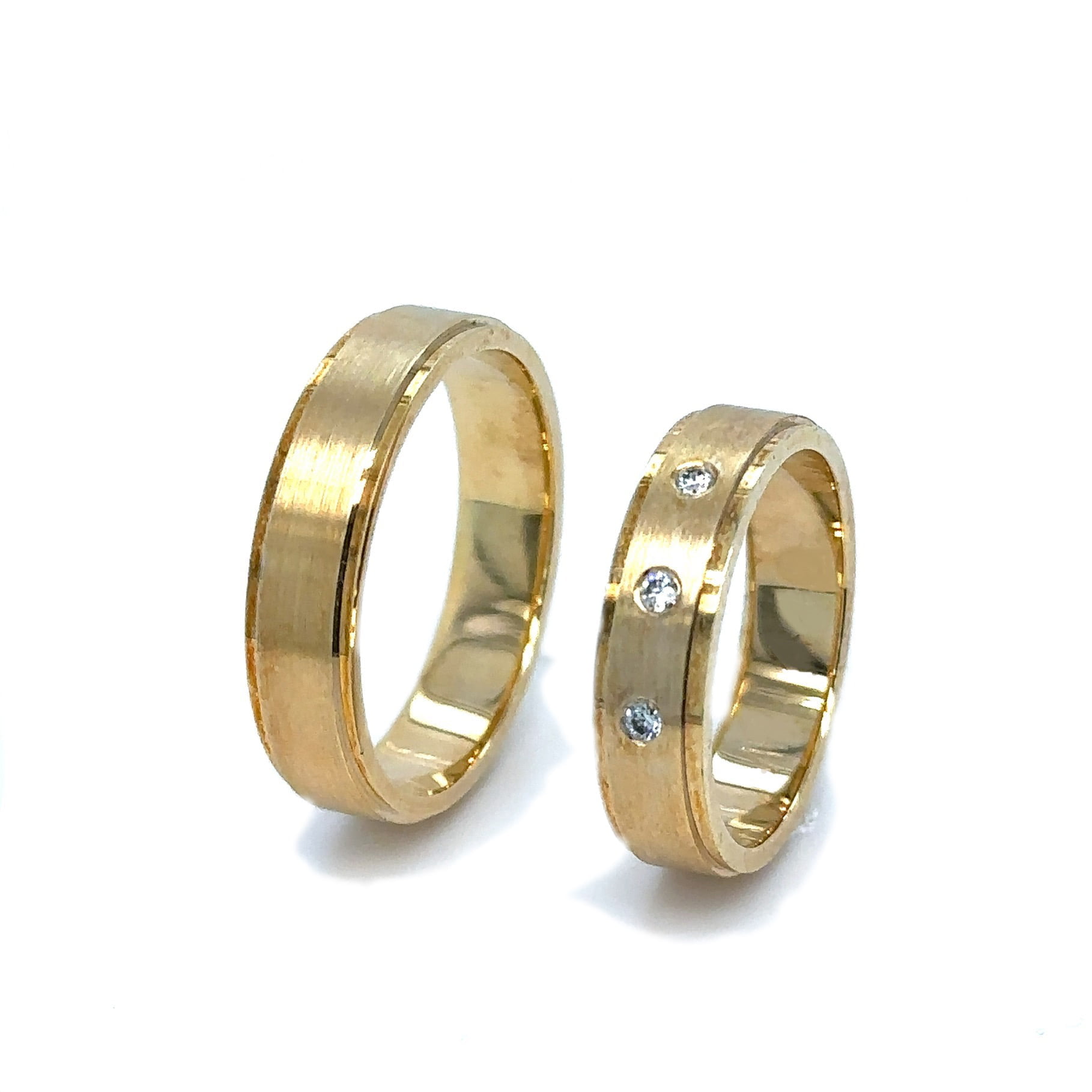 Savršeni model burmi od žutog zlata, sa tri blistava dijamanta koji ovaj model čine besprekornim. Ravan model burmi od mat žutog zlata odiše diskretnom elegancijom i minimalističkim šarmom. Njihova jednostavna, čista linija naglašena je suptilnim mat finisom koji daje sofisticiranu, nenametljivu teksturu i blagi sjaj. Ove burme su savršen izbor za parove koji cene tradicionalni dizajn sa modernim, stilizovanim detaljem, simbolizujući trajnu i čistu ljubav.