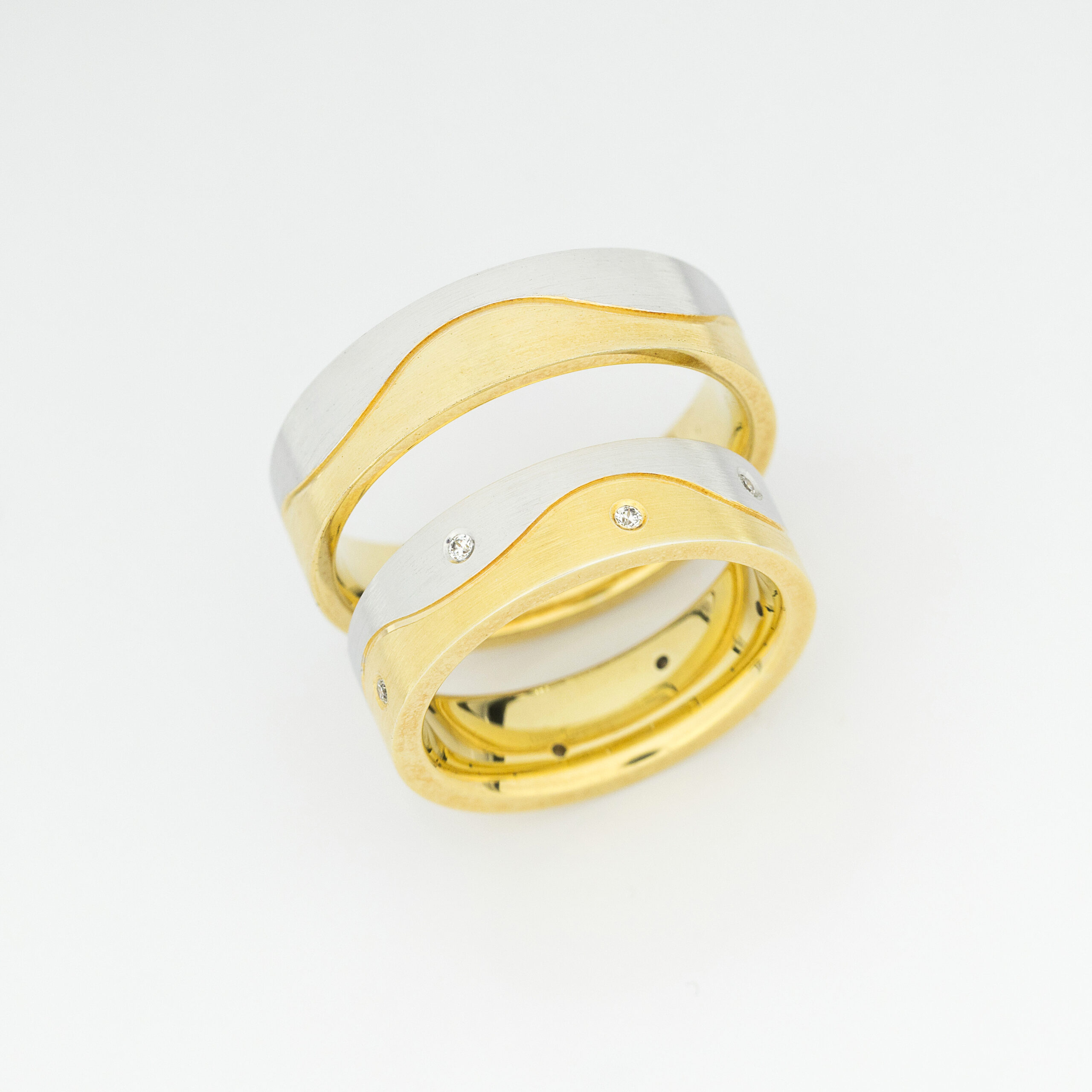 Idealne burme za parove koji cene tradicionalni izgled venčanih burmi, ali žele da dodaju moderni dodir i sjaj dijamanta. Ženski model burmi je ukrašen dijamantima koji diskretno obavijaju prsten, dodajući im sjaj i luksuzan izgled. Majstorski izrađene burme od visokokvalitetnog belog i žutog zlata, stvarajući harmoničan kontrast između dva prefinjena tonaliteta metala.