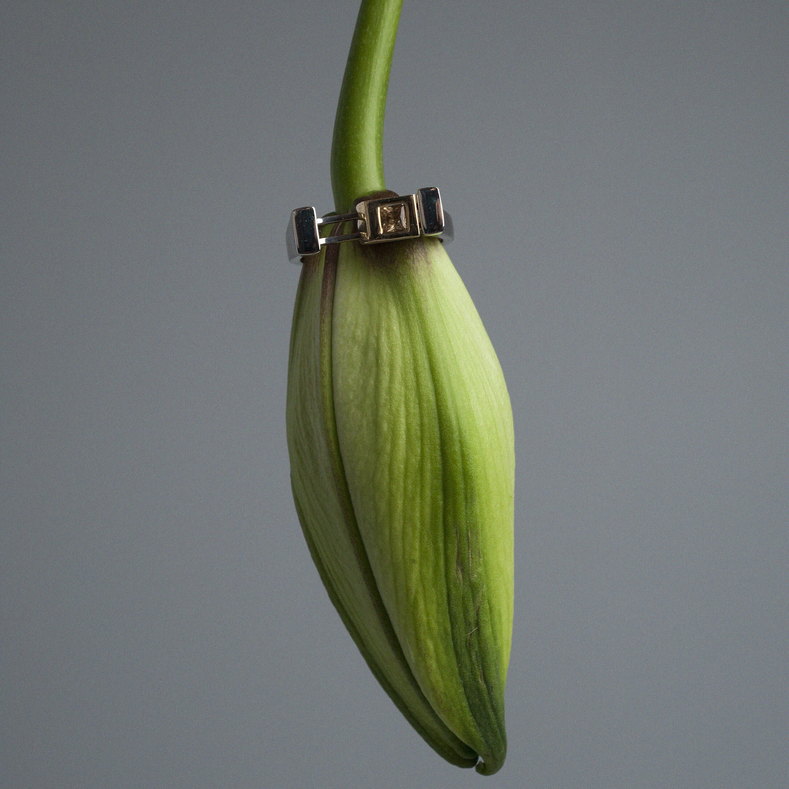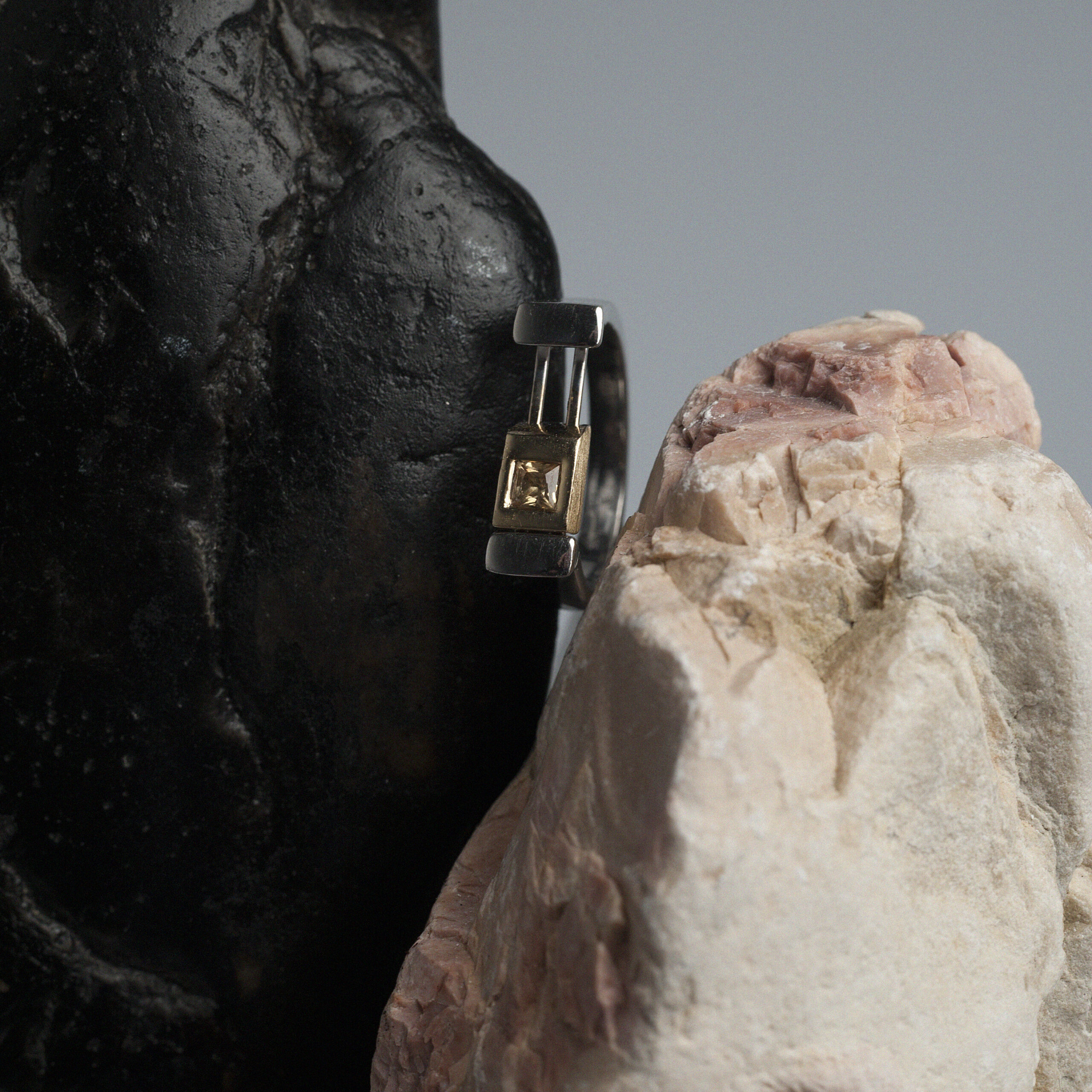 U njegovom središtu nalazi se pokretni žuti element, izrađen od zlata, u čijem središtu blista žuti fensi safir u princess cut obliku. Ovaj kvadratno brušeni safir odiše svetlošću, toplinom i originalnošću, dok mu nijansa dodatno naglašava raskoš i karakter celog dizajna.