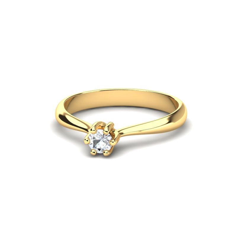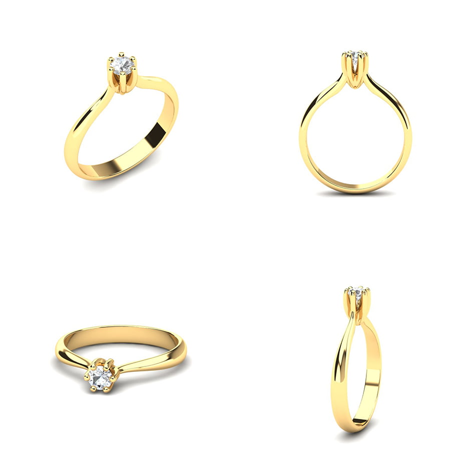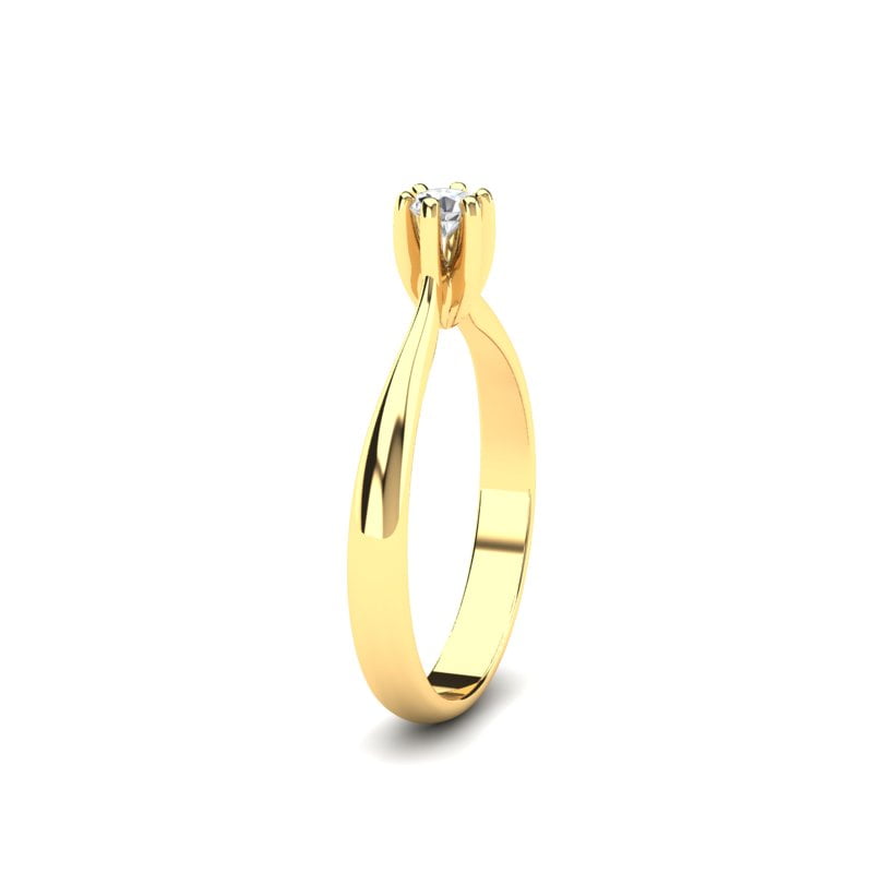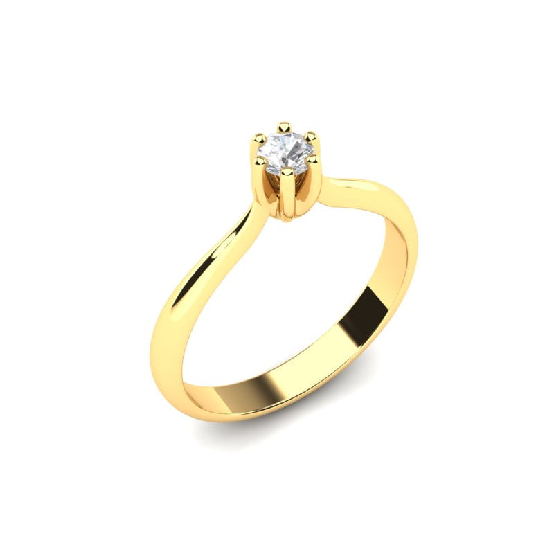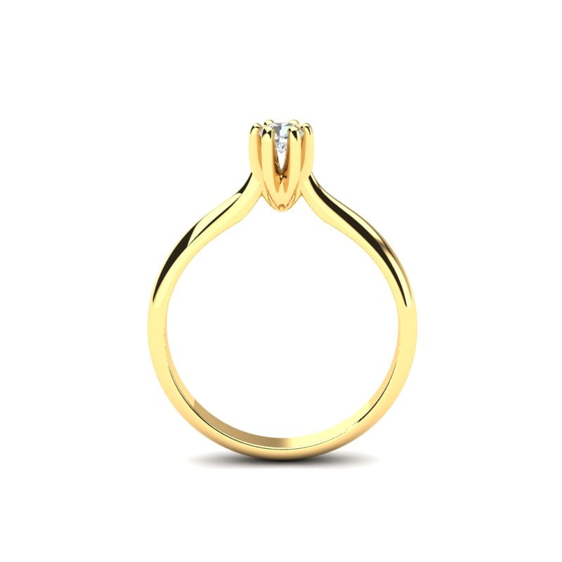 Iskričav i moderan prsten od žutog zlata sa glamuroznim brilijantom nezaobilazan je detalj svake dame koja voli nakit. Verenički prsten od žutog zlata sa jednim dijamantom je elegantan i sofisticiran. Prsten je jednostavan, sa glatkom površinom, koja ima prelep, topli sjaj žutog zlata. Dijamant, smešten u središtu prstena, ima visok sjaj i jasno se ističe. Ovaj dijamant je sigurno postavljen u šest krapni koje ga drže na mestu. Krapne su male metalne „oštrice“ koje nežno obuhvataju dijamant sa svih strana, omogućujući svetlu da prolazi kroz kamen i tako naglašava njegovu lepotu. Celokupan izgled prstena je minimalistički, ali sa nečim posebnim, što ga čini pravim izborom za verenički prsten.
