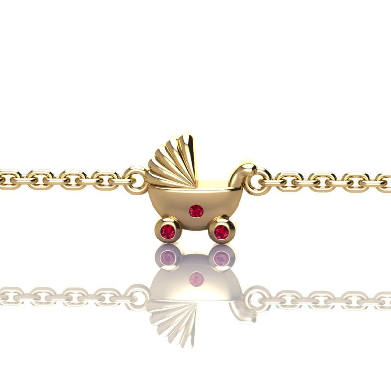 Bebi kolica, narukvica idealna za poklon novorođenčetu. Model je dekorisan dragim kamenjem, rubinima, a može se ukrasiti i dijamantima, smaragdima ili safirima. Može se darovati u kompletu sa minđušama ili ogrlicom istog dizajna. Darujte nakit neprolazne vrednosti i lepote.