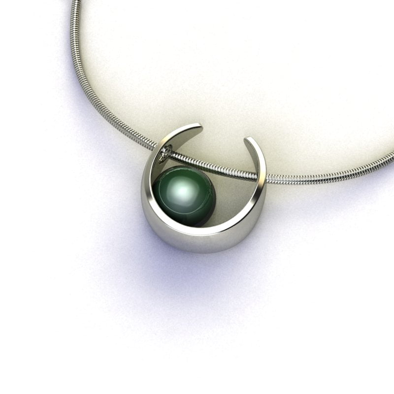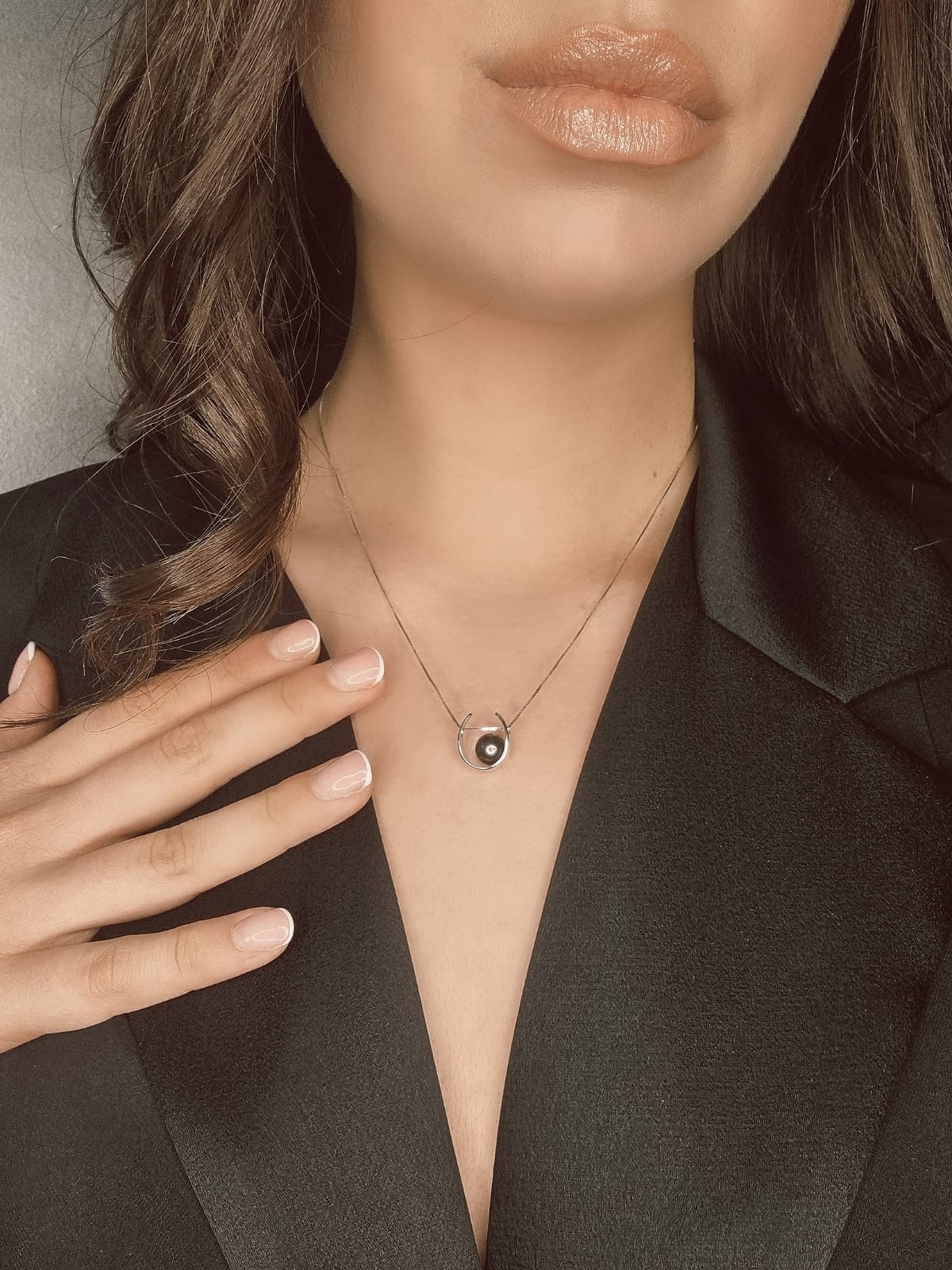 Ova prefinjena ogrlica od belog zlata ističe se tamnim biserom, čiji misteriozni sjaj dodaje notu luksuza i sofisticirane elegancije.