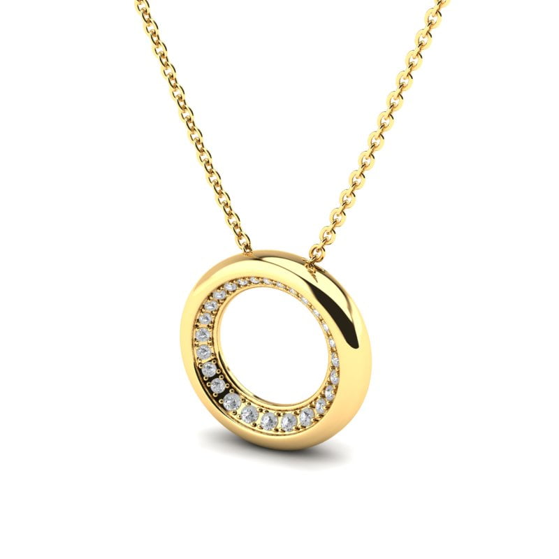 Zlatna ogrlica u obliku kruga sa dijamantima donosi spoj simbolike i sofisticiranosti. Krug predstavlja večnost, celovitost i beskonačnu povezanost. Izrađena je od finog zlata koje odiše toplinom i luksuzom. Po obodu su pažljivo urezani dijamanti koji blistaju pri svakom pokretu. Njihova svetlucavost dodaje notu elegancije bez preterivanja. Dizajn je moderan, ali nosi klasičnu vrednost. Ogrlica lepo leži na vratu i lako se uklapa u različite stilove. Idealna je za svakodnevno nošenje, ali i za posebne prilike kada želite da zablistate s merom i stilom.