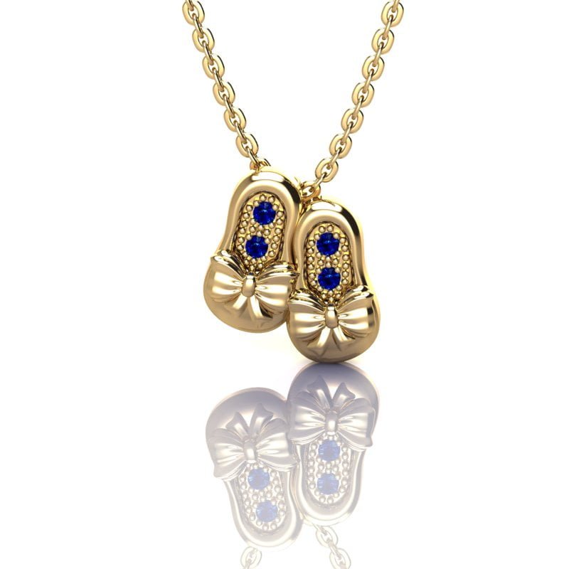 Ova prelepa ogrlica izrađena je od žutog zlata, sa divnim priveskom u obliku dečjih cipelica. Unutrašnjost priveska ukrašena je prelepim plavim safirima, koji unose dozu elegancije i simbolizuju mudrost, snagu i zaštitu. Detalji u vidu mašnica i fino obrađenih tekstura čine ovaj komad nakita jedinstvenim i emotivnim poklonom. Savršena kao simbol ljubavi i nežnosti, ova ogrlica je idealan dar za rođenje deteta, krštenje ili posebne trenutke koji se pamte zauvek.