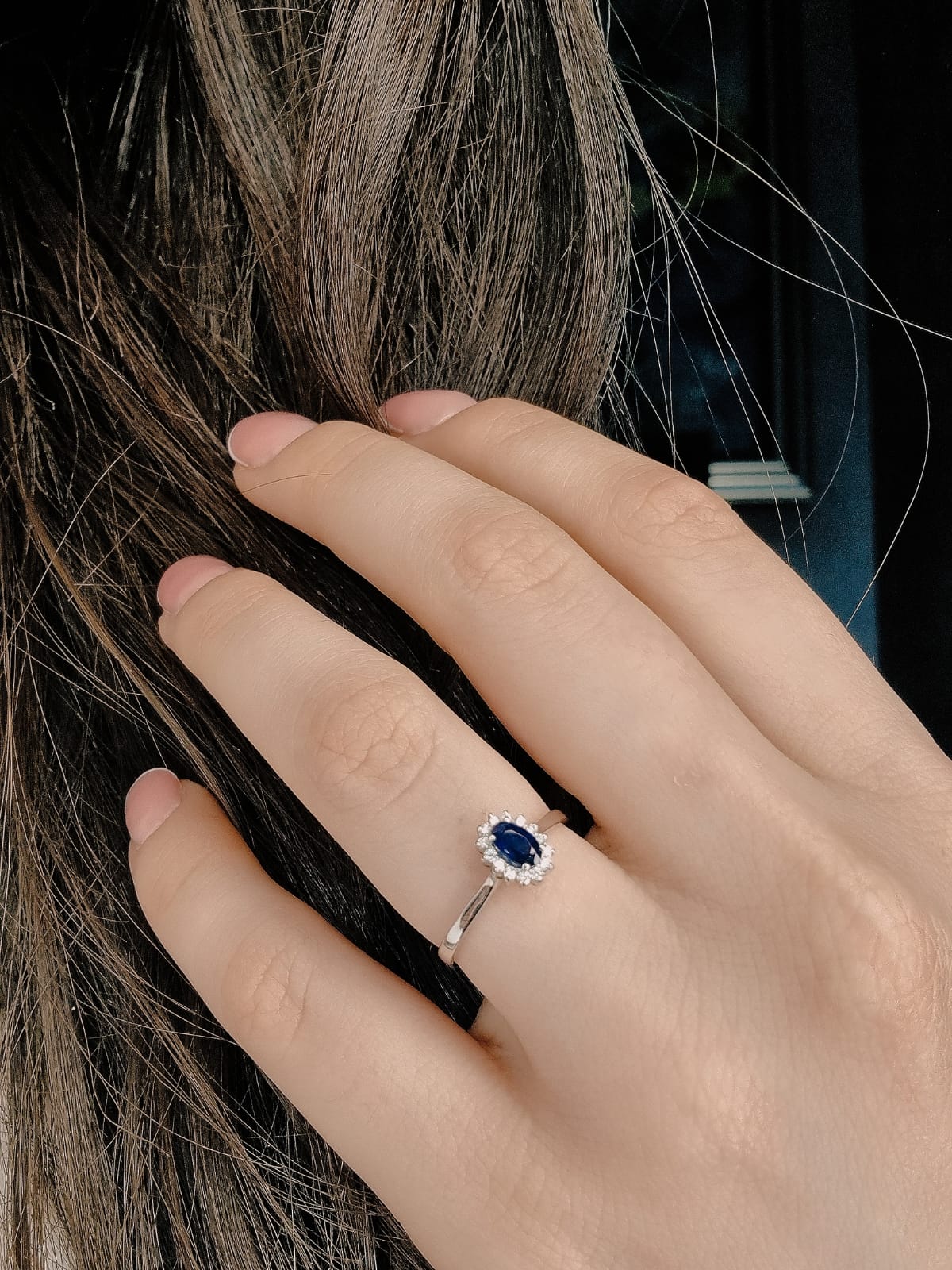 Postoji verovanje koje kaže da će safir ispoljiti svoja pozitivna dejstva tek ukoliko je njegov vlasnik čestit i dobar čovek. Pronađite se i poklonite sebi predivan prsten od belog zlata, magičnog safira i blistavih brilijanata. Elegantni prsten od belog zlata sa prirodnim safirom odiše bezvremenskom lepotom i sofisticiranošću. U njegovom središtu blista prelepi safir, dragulj poznat po svojoj dubokoj plavoj boji i simbolici mudrosti, vernosti i plemenitosti. Prirodni brilijanti upotpunjuju sjaj ovog dragog kamena. Prefinjena izrada i sjaj belog zlata dodatno naglašavaju raskoš ovog prstena, stvarajući savršen sklad između luksuza i elegancije. Ovaj prsten je idealan izbor za posebne prilike, poklon s posebnim značenjem ili kao simbol večne ljubavi i posvećenosti.