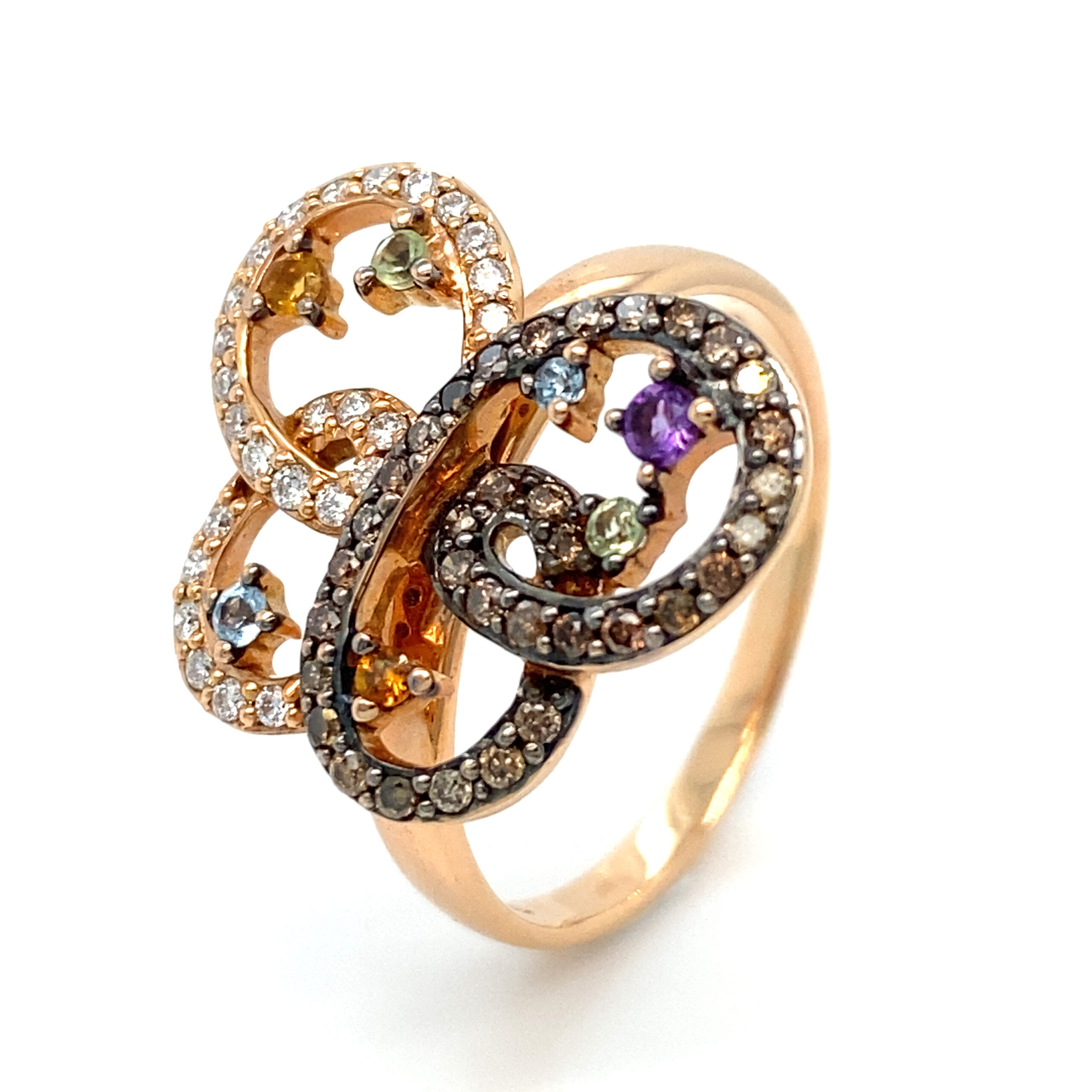 Prsten u obliku leptira je pravi umetnički komad, elegantan i pun simbolike. Leptir, sa svojim krilima, u ovom dizajnu prepun je delikatnih detalja. Kamenje koje krasi ovaj prsten uključuje drago i poludrago kamenje u različitim živopisnim bojama. Stvarajuća harmonija između smaragdno zelene, safirno plave, rubin crvene i ametistno ljubičaste. Svaki kamen je pažljivo postavljen, čineći prsten gotovo poput male galerije u kojoj svaki kamen donosi svoju jedinstvenu energiju. Ovaj prsten nije samo ukras, već i simbol transformacije, slobode i lepote, idealan za osobu koja voli da nosi nešto što odiše elegancijom i originalnošću.