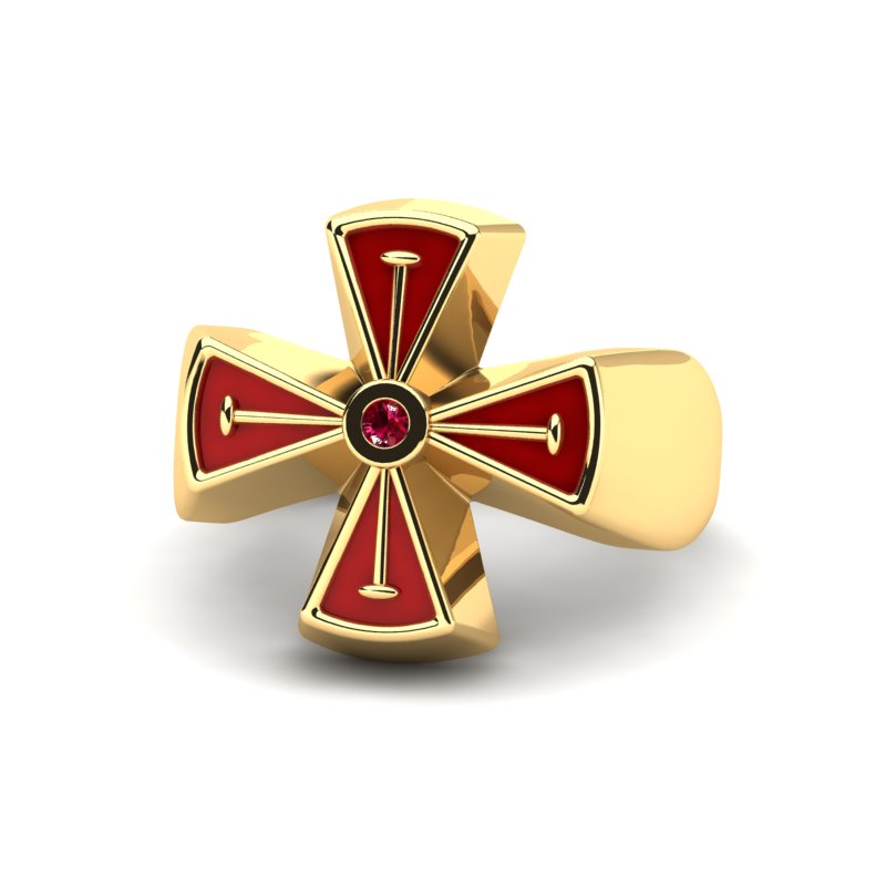 U središtu krsta nalazi se prirodni rubin, čija duboka crvena boja unosi notu raskoši i plemenitosti. Rubin simbolizuje ljubav, hrabrost i životnu snagu, dok njegova blistava površina i pažljivo obrađene ivice dodatno naglašavaju prefinjenost izrade.