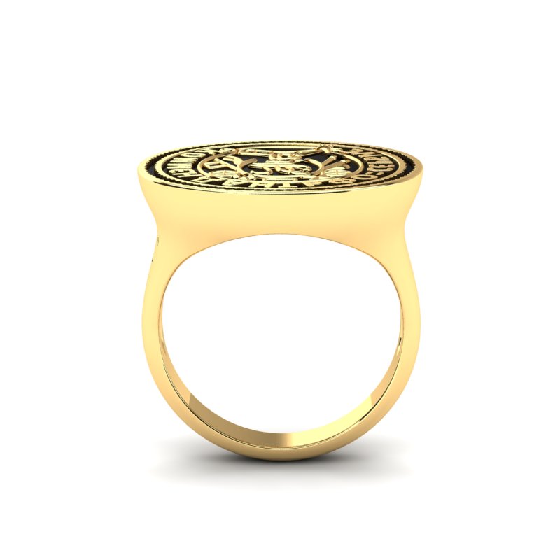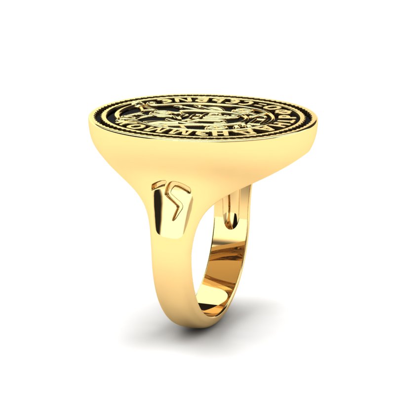 Reljefna izrada ističe bogatstvo i dubinu prstena. Crni emajl dodaje dramatičan kontrast, naglašavajući istorijsku ozbiljnost i autoritet koji ovaj komad nosi. Kombinacija zlatnog sjaja i tamnijih tonova emajla stvara vizuelni balans, čineći prsten elegantnim i moćnim.