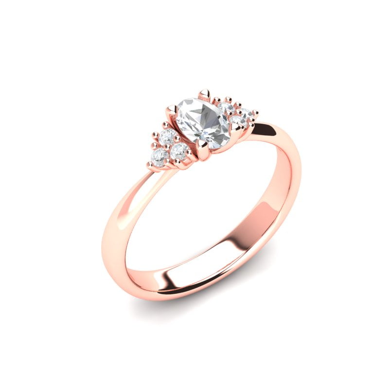 Prsten atraktivnog dizajna, sa ovalnim dijamantom u fokusu i okruglim diskretnijim dijamantima koji suptilno svetlucaju oko njega. Ovaj prefinjeni prsten od roze zlata odiše elegancijom i bezvremenskom lepotom. U njegovom središtu nalazi se blistavi ovalni dijamant. Dodatni sjaj pružaju pažljivo postavljeni okrugli brilijanti (round brilliant), koji nežno uokviruju centralni kamen i reflektuju svetlost iz svakog ugla. Savršen spoj luksuza i suptilne elegancije, ovaj prsten je idealan izbor za veridbu, poseban poklon ili kao izraz istančanog ukusa i ljubavi prema vrhunskom nakitu.