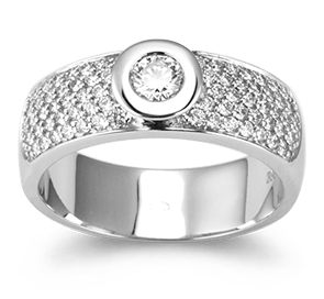 Ovaj široki prsten od belog zlata pravi je simbol elegancije i luksuza. Na njegovom središtu smešten je jedan veći dijamant, koji zauzima centralno mesto i blista svojom izuzetnom jasnoćom i briljantnošću. Oko njega je pažljivo postavljeno mnoštvo sitnih dijamanata, koji dodatno naglašavaju njegovu lepotu i stvaraju neverovatnu igru svetlosti. Savršen je izbor za posebne prilike ili kao simbol večne ljubavi, jer spaja sofisticiranost sa izuzetnim dizajnom, stvarajući upečatljiv, ali i suptilan izgled. Ovaj prsten je prava izjava stila i elegancije.