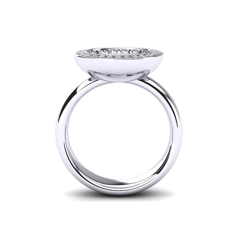 Ovaj prelep prsten od belog zlata savršeno kombinuje moderni dizajn i luksuz. Na vrhu prstena nalazi se izdvojena polulopta, koja je u potpunosti ispunjena brilijantima, stvarajući spektakularan sjaj i prefinjenu dinamiku. Polulopta je diskretno uzdignuta, čineći ovaj prsten istovremeno elegantnim i jedinstvenim. Brilijanti na njoj blistaju iz svakog ugla, dodajući dubinu i sofisticiranost. Idealno za one koji žele da istaknu svoj stil s komadom koji je sofisticiran, ali i dovoljno upadljiv da privuče pažnju. Ovaj prsten je prava odluka za svakog ljubitelja elegancije i luksuza.