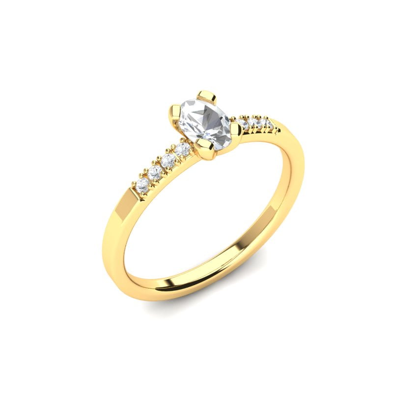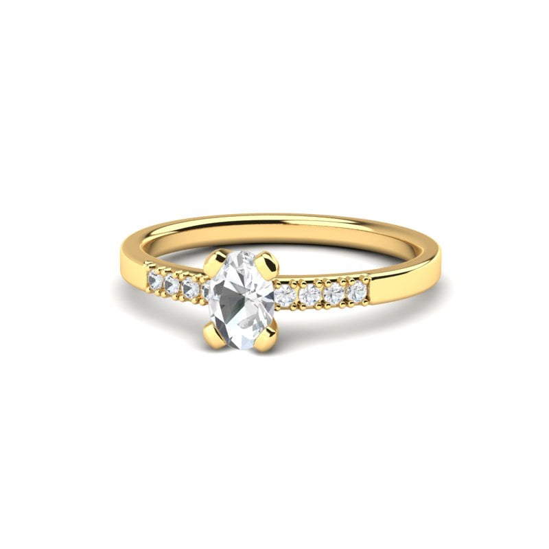 Verenički prsten od žutog zlata odiše elegancijom i bezvremenskom lepotom. Savršen za one koji traže sofisticiran, ali upečatljiv komad nakita. U njegovom centru nalazi se prelepi ovalni dijamant, poznat po svojoj izduženoj formi koja vizuelno izdužuje prste i reflektuje svetlost na očaravajući način.