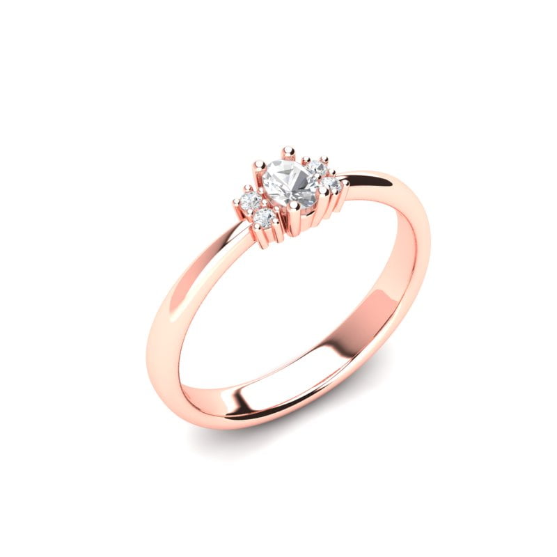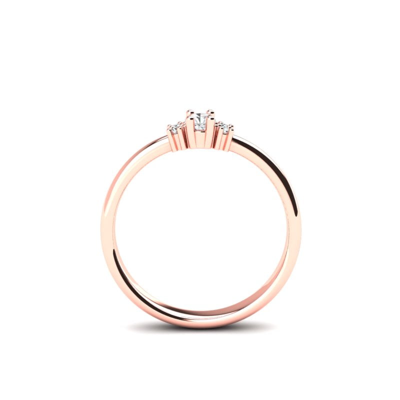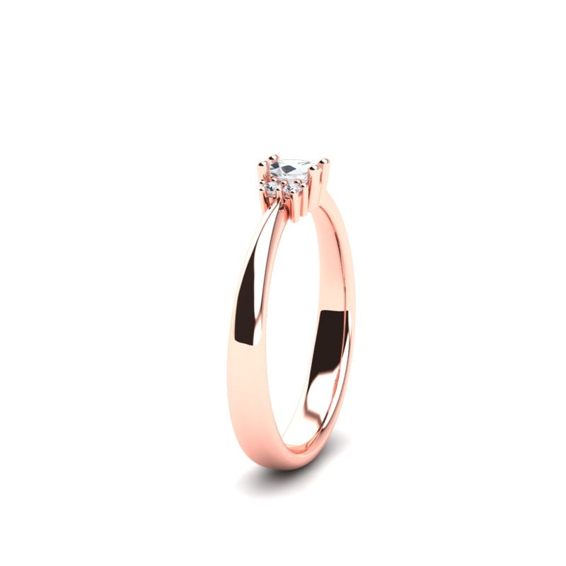 Nežan prsten od roze zlata, oplemenjen centralnim ovalnim dijamantom kao i diskretnijim brilijantima koji dodatno pojačavaju efekat svetlucanja.