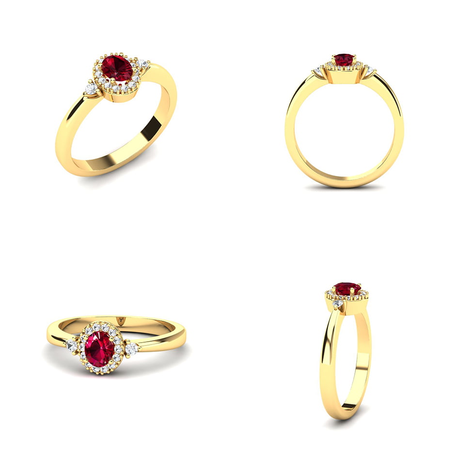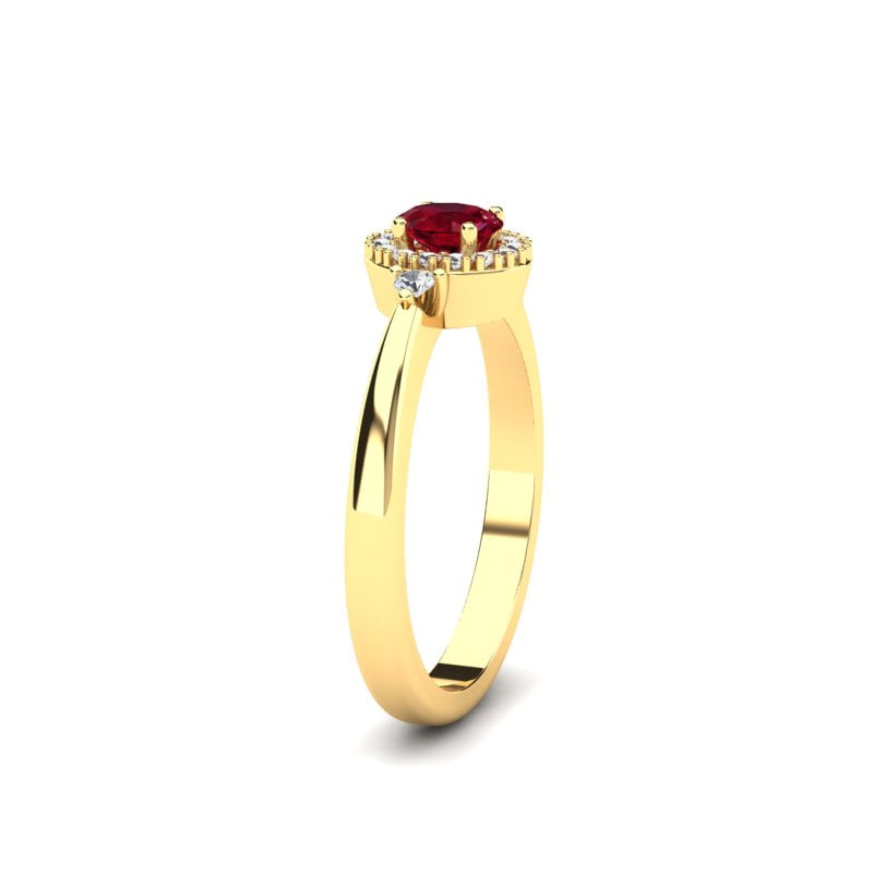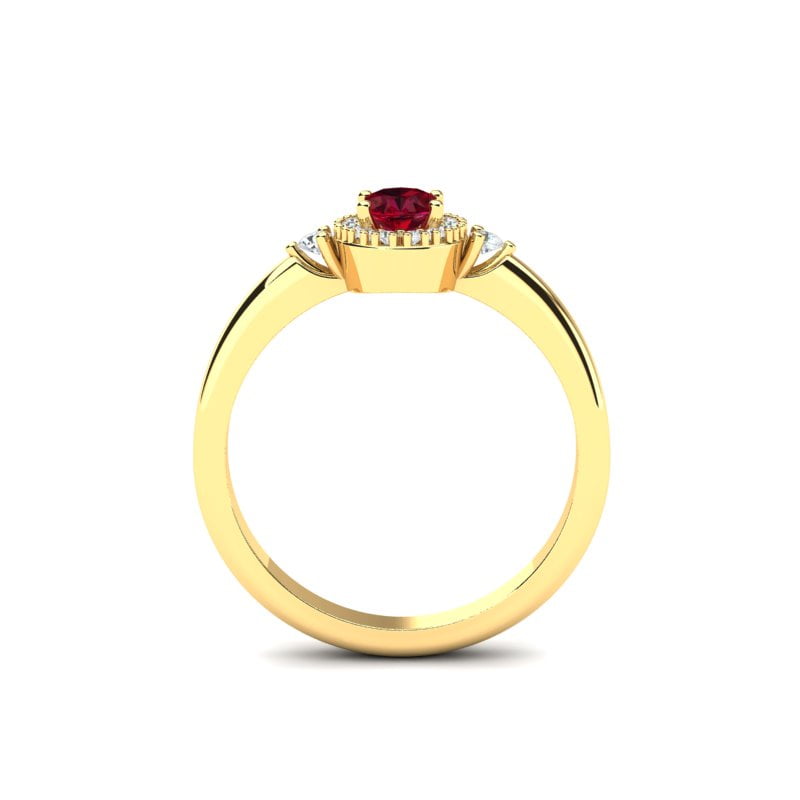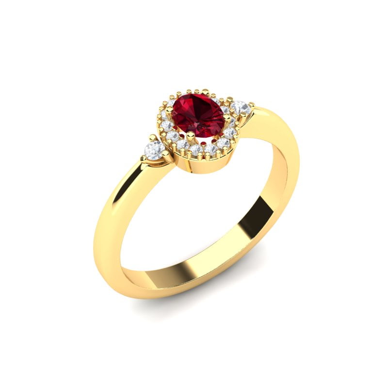Ovaj prelepi prsten sa ovalnim rubinom i dijamantima zrači sofisticiranošću i elegancijom. U centru prstena nalazi se očaravajući ovalni rubin, čije duboko crveno svetlo privlači pažnju i unosi strastvenu notu u dizajn. Oko rubina smešteni su dijamanti koji dodatno naglašavaju njegovu lepotu, stvarajući savršen kontrast između bogate crvene boje i svetlucavih dijamanata. Na samoj šini prstena, sa obe strane, nalazi se po jedan dijamant, koji dodatno doprinosi ravnoteži i harmoničnosti celokupnog izgleda. Zlatna osnova prstena pruža mu prefinjenost, čineći ga savršenim komadom za posebne trenutke. Ovaj prsten je idealan izbor za one koji žele luksuzan i jedinstven nakit koji kombinuje klasičnu eleganciju sa modernim šarmom.