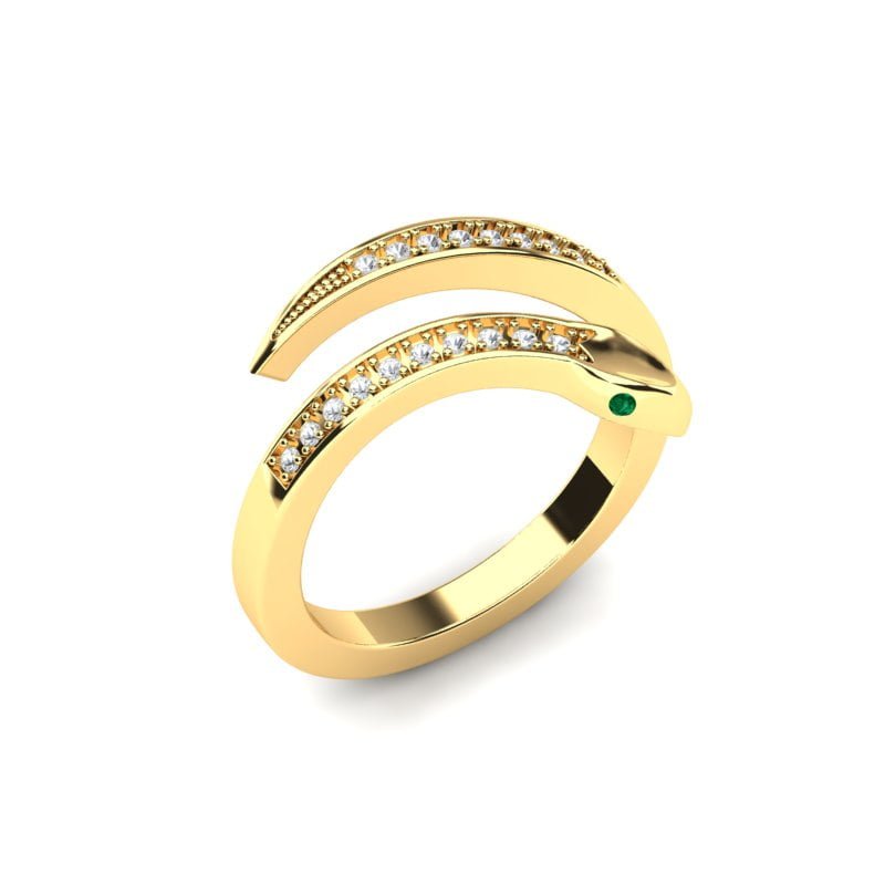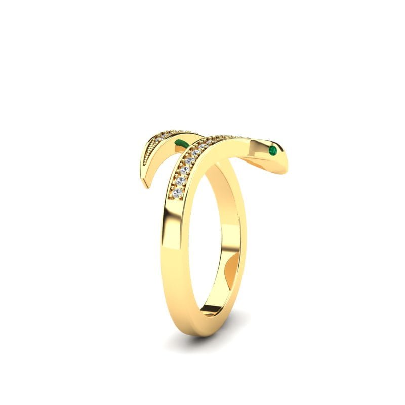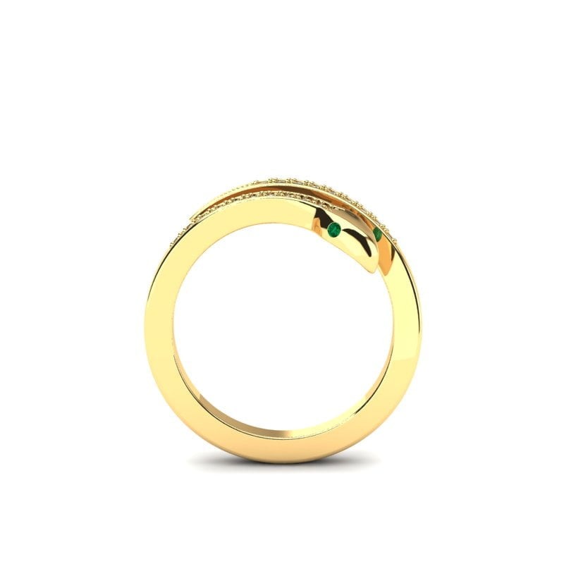 Zapanjujući zlatni prsten sa motivom zmije donosi neodoljiv spoj umetničkog dizajna i luksuznih materijala. Prsten je oblikovan u fantastičnu siluetu zmije, sa detaljno izrađenim telom koje se savija oko prsta u elegantnu spiralu. Svaka zakrivljenost je pažljivo oblikovana kako bi prikazali prirodni izgled i pokretljivost zmije. Oči zmije su izrađene od prirodnih smaragda, koji donose intenzivnu zelenu boju i izuzetnu dubinu u dizajn. Motiv zmije simbolizuje mudrost i transformaciju, dok prirodni smaragdi i dijamanti dodaju dašak sofisticiranosti i luksuza. Ovaj prsten je savršen za one koji žele da iskažu svoju individualnost i stil sa posebnim komadom nakita.